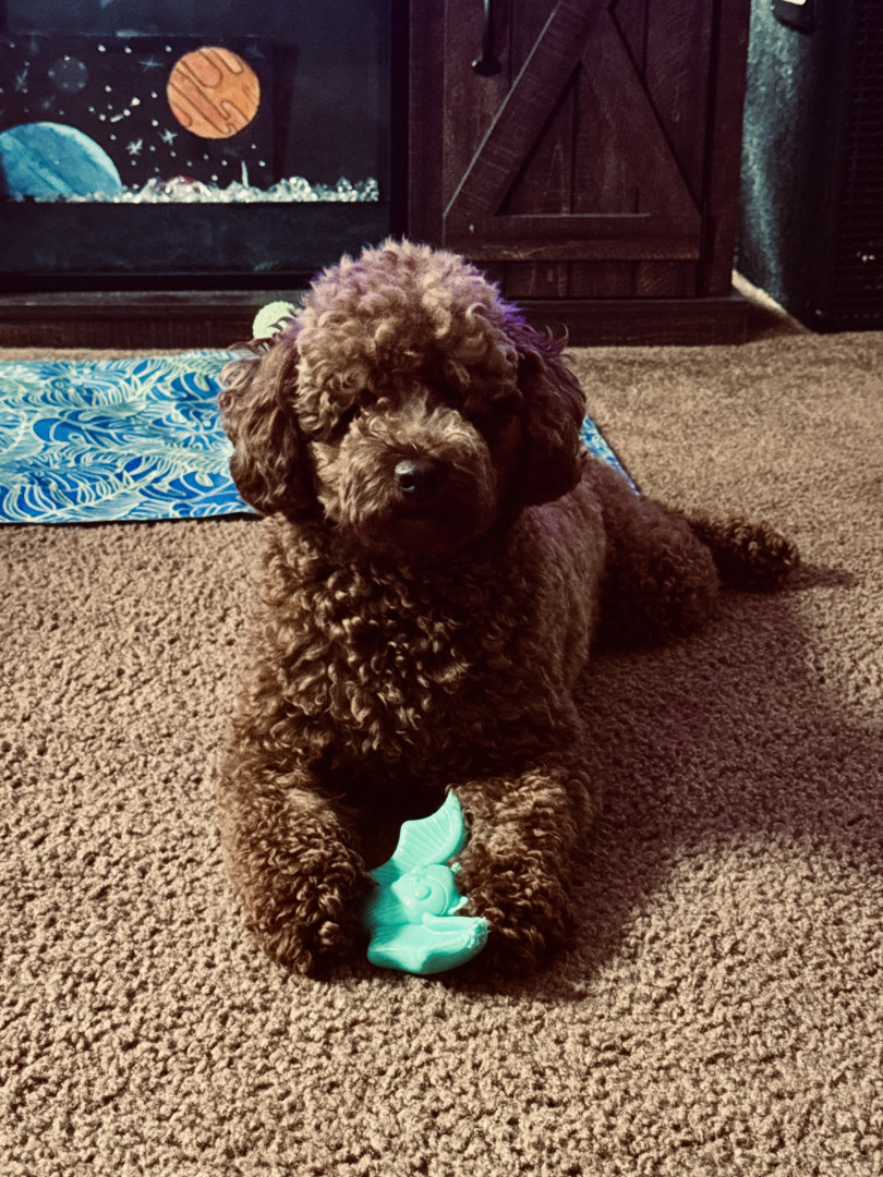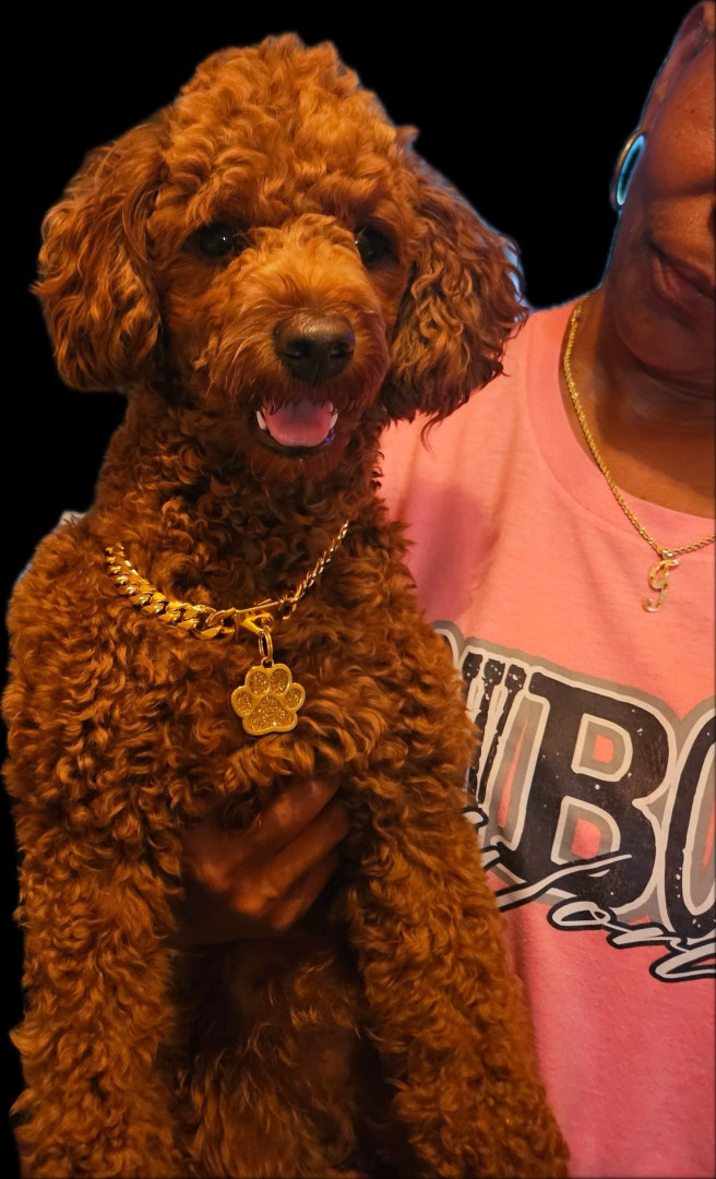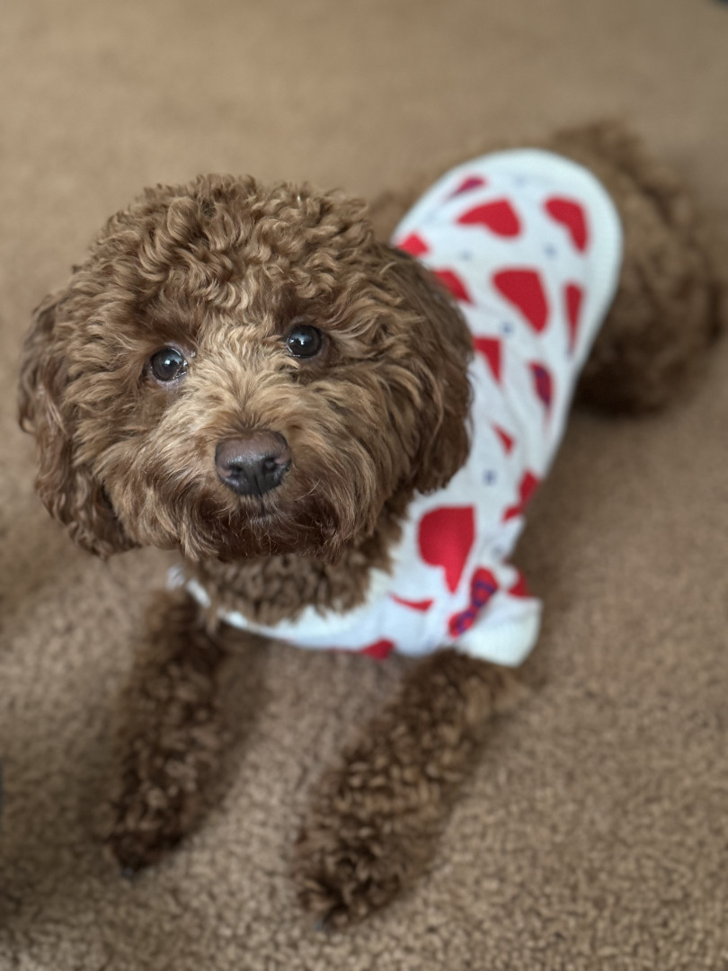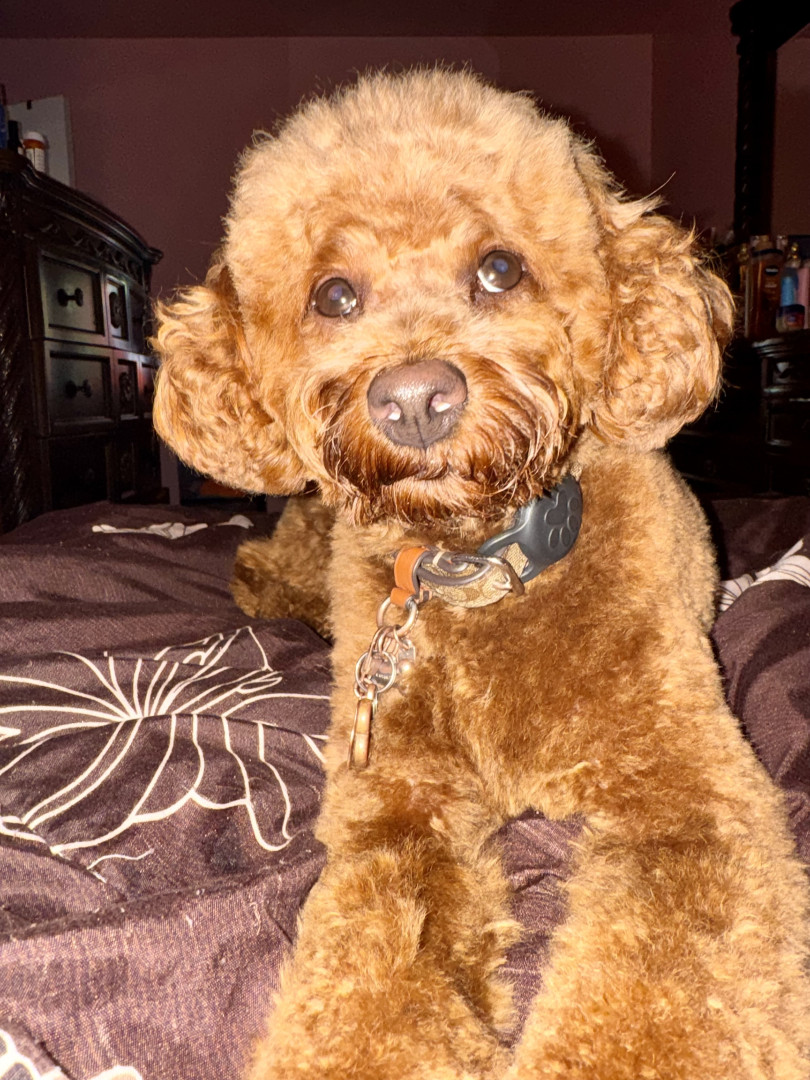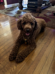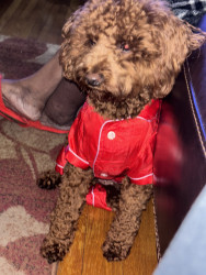 Teddy is a lovable mini poodle who is mild mannered and very trained, he thinks he is almost human at times.
