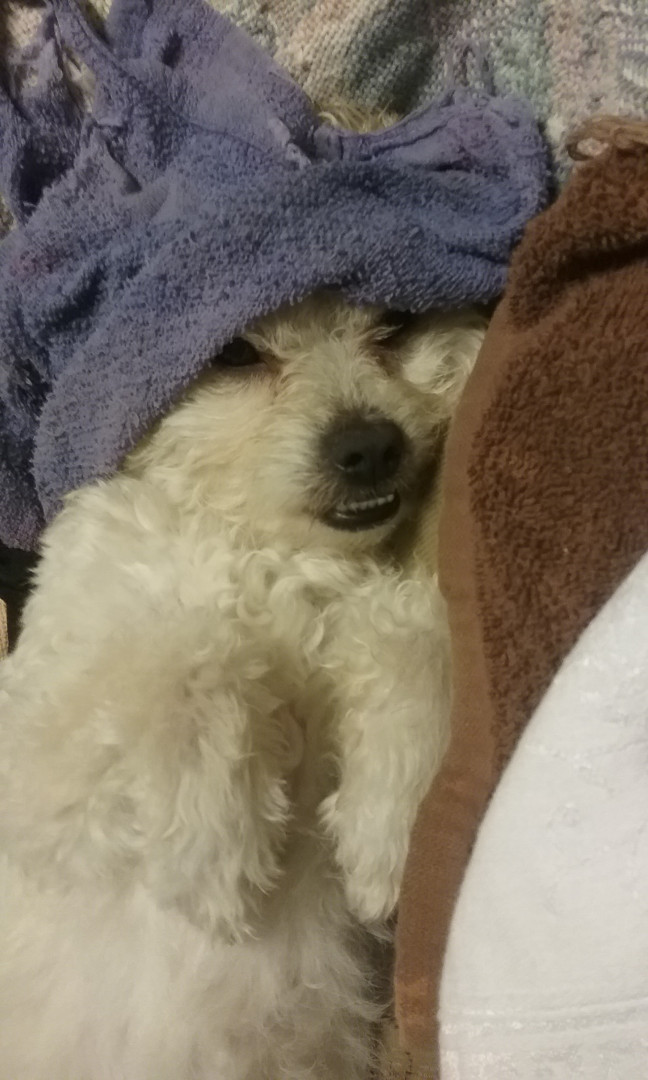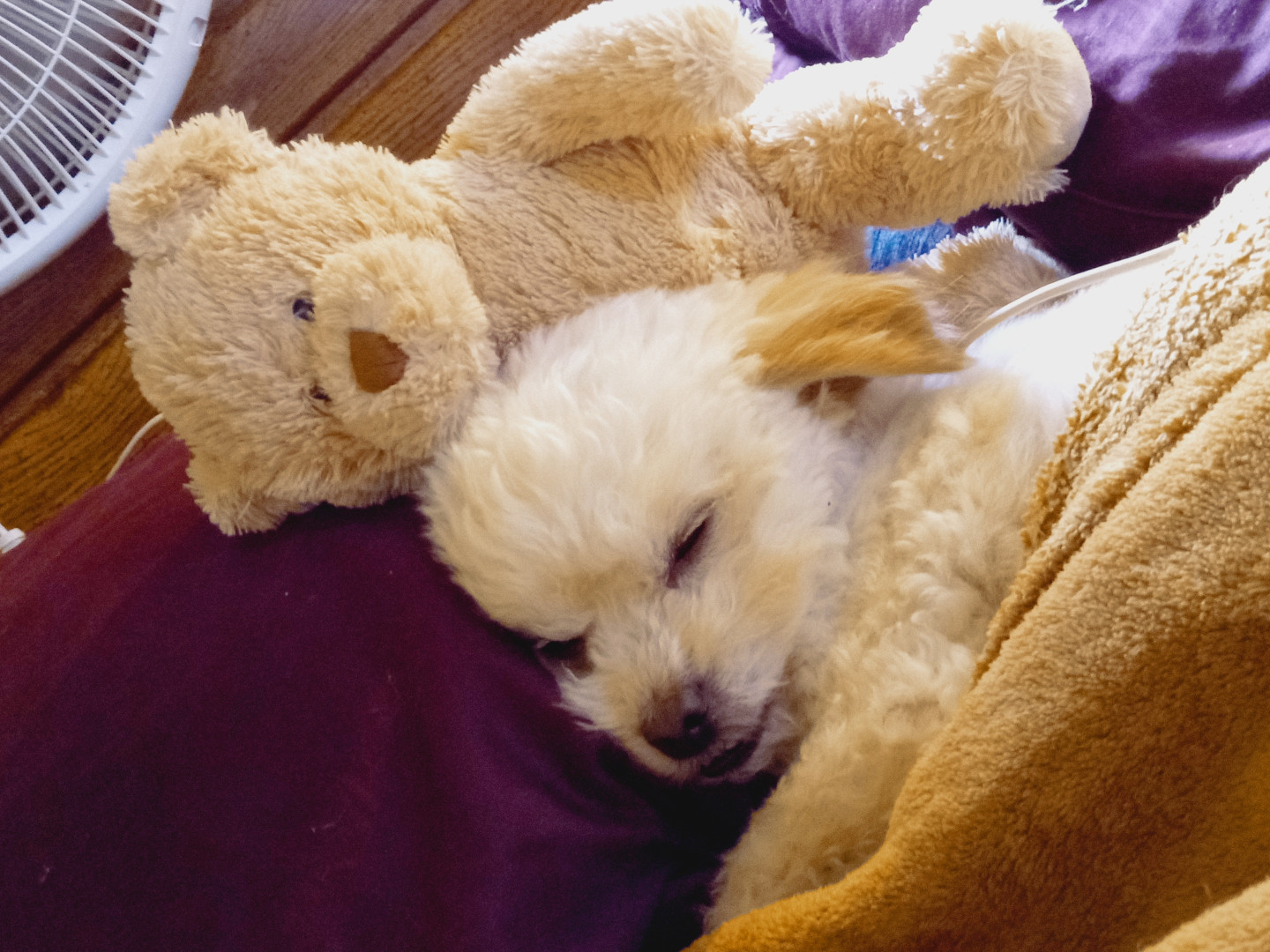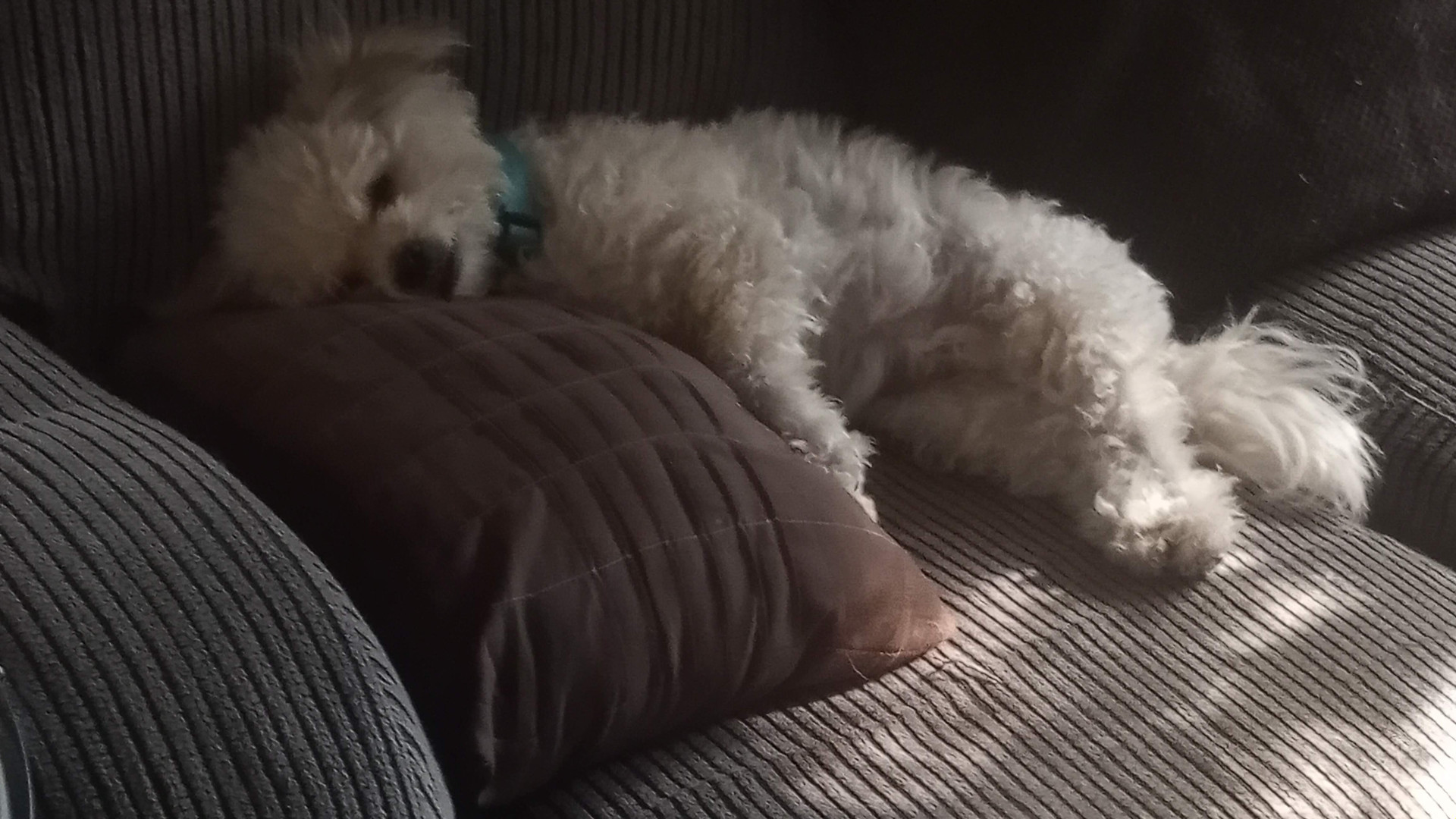 He's like a little cuddle bugs and there's exactly when Mommy needs to cuddle I was having a hard day I just need love and infection he's got a nose like no other there's a crumb on the floor or anywhere he's going to find it and he can say I mama and he likes to talk a lot in his own little dog way