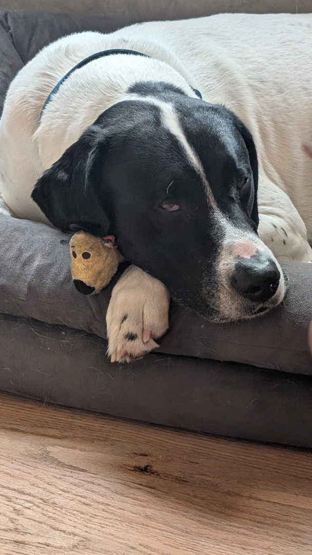 His favorite toy his ball Honey peanut butter bone marrow