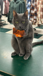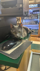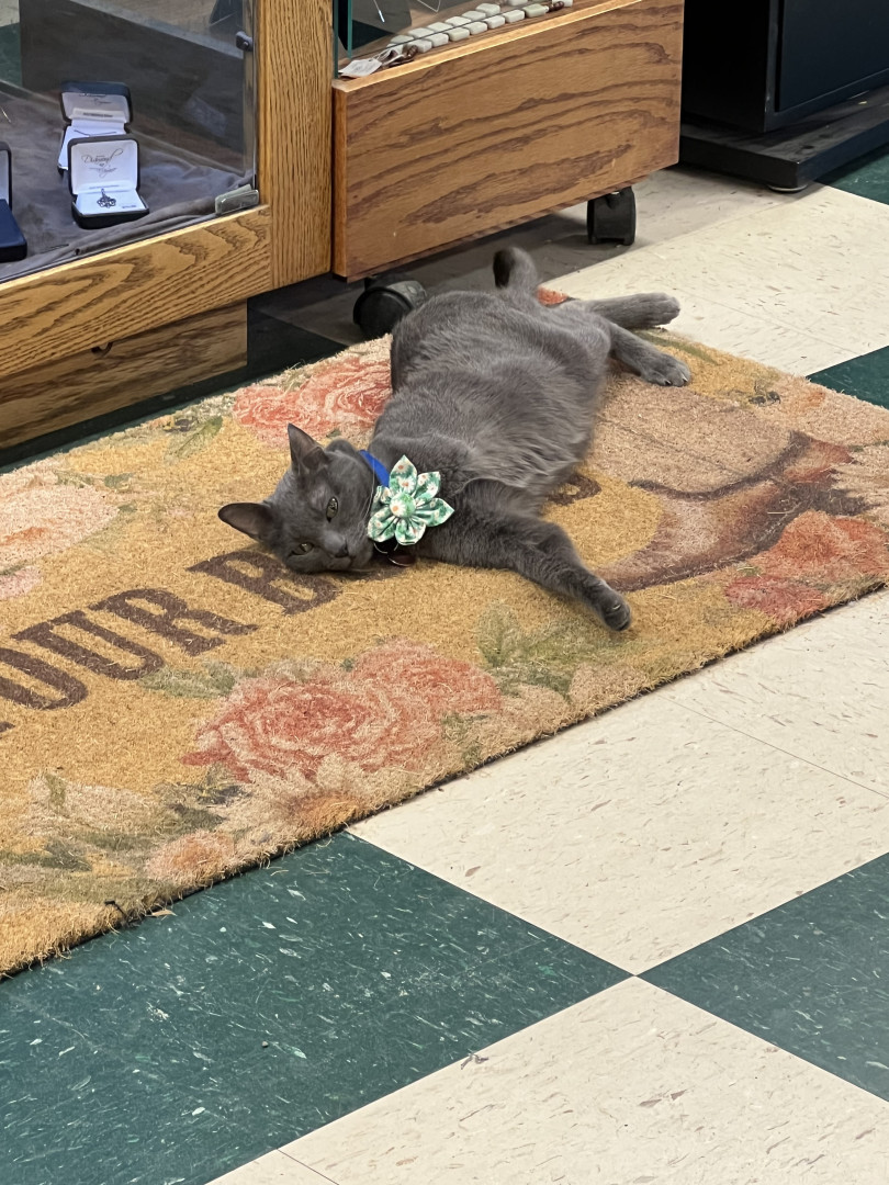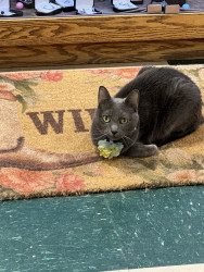 Thursday's most unique quality is that she only has 3 legs. She is missing a front leg and doesn't know any different. She does have a job in the store....to keep mice away and she does a good job of that. She is very dainty, but super fast. She loves human attention and is always greeting customers when they walk in the door. She loves to be held and carried around the store by customers while they shop.