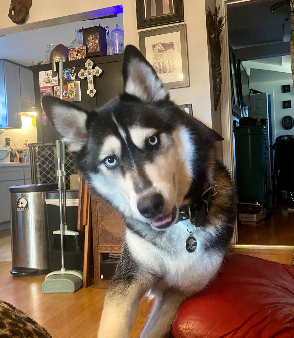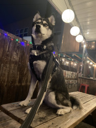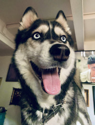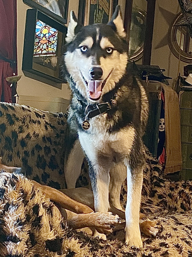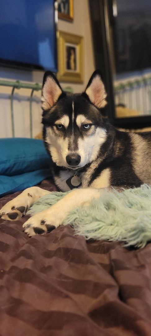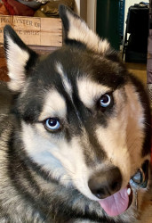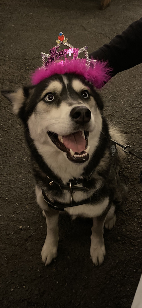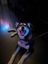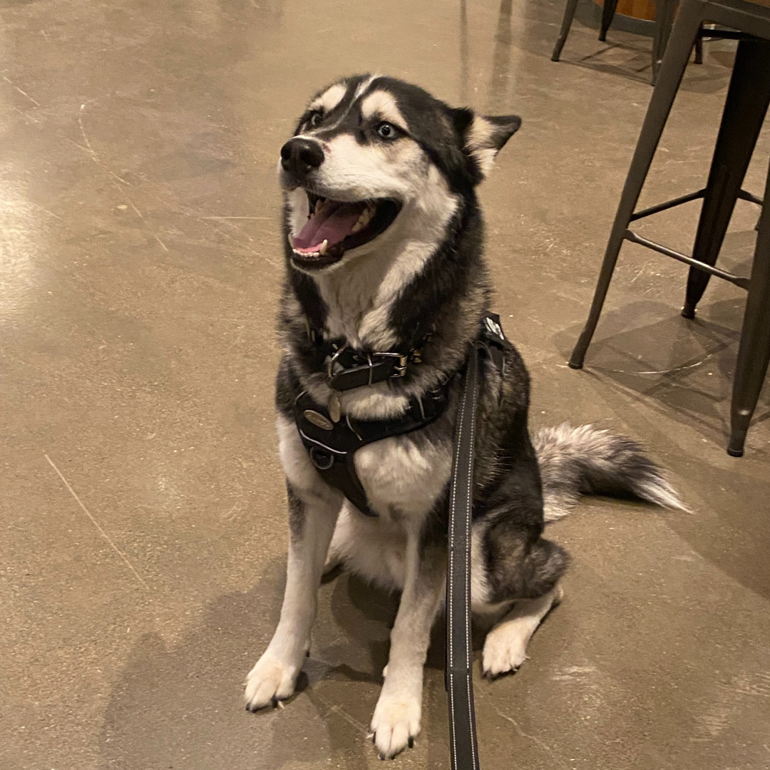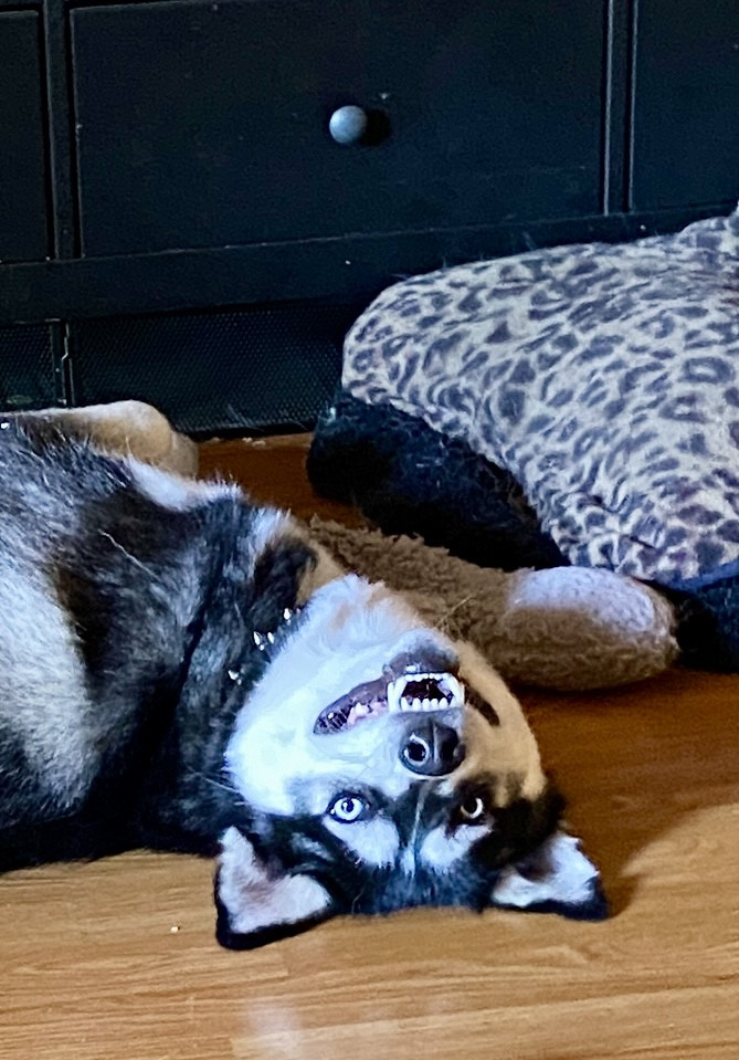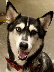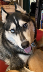 Siberian Husky w/ a heart of gold. Loves people, dogs, cuddles, belly rubs & life. Adventurous spirit & kind soul. Basso “Woo” = happy