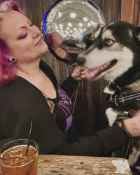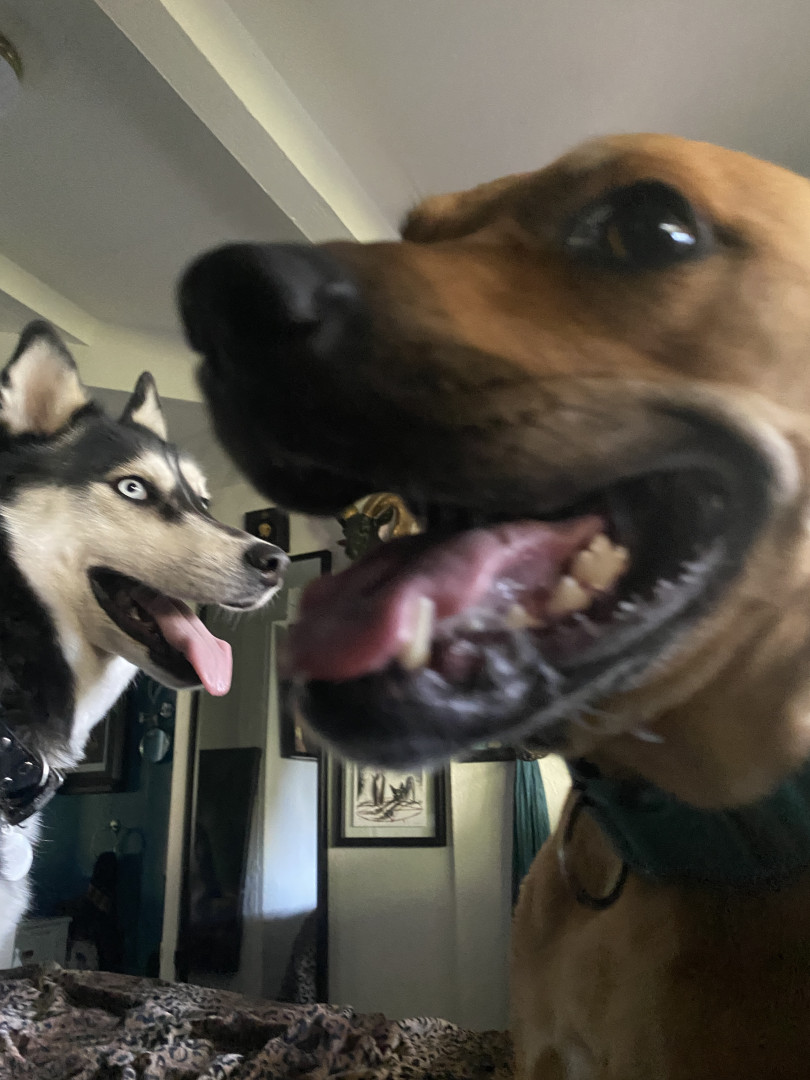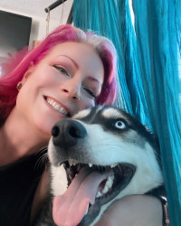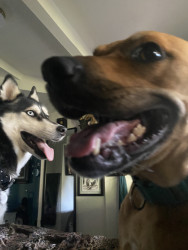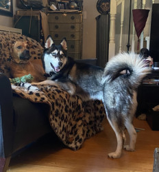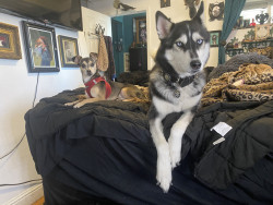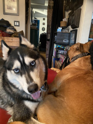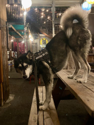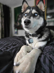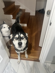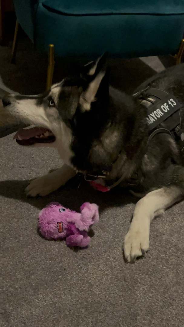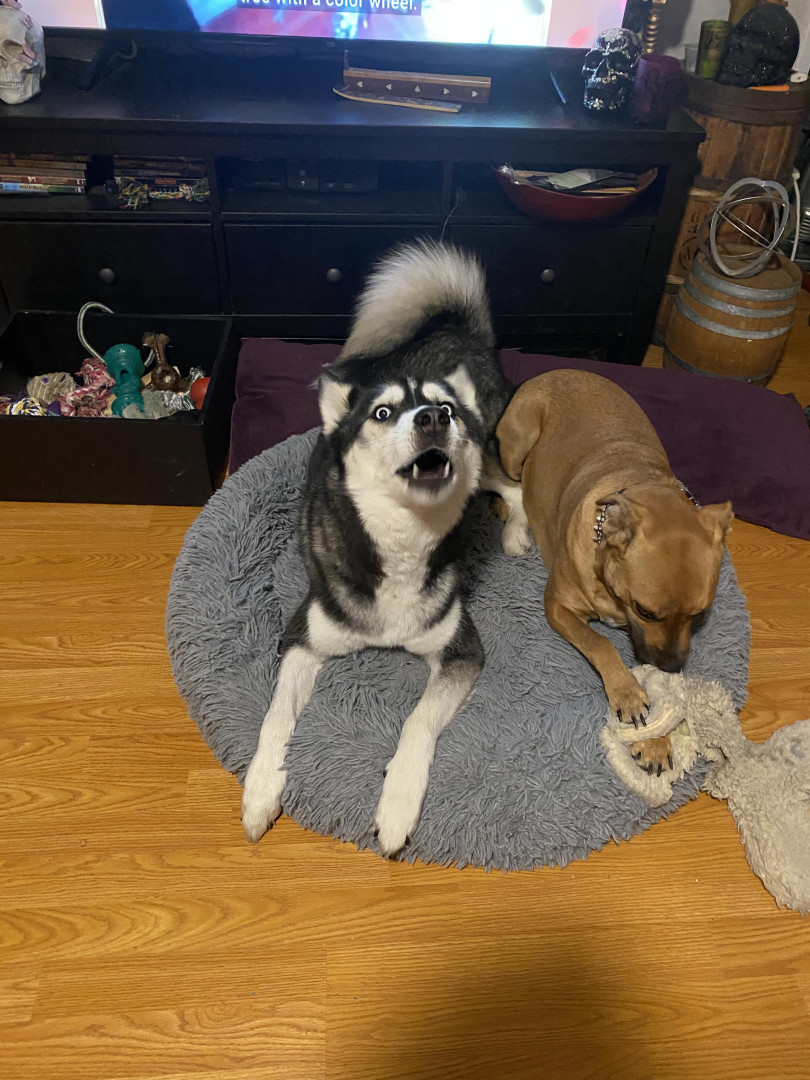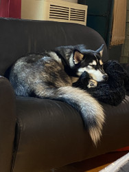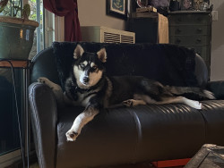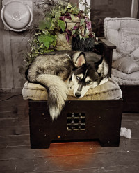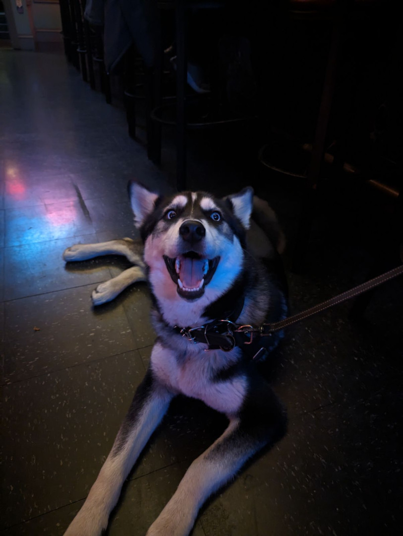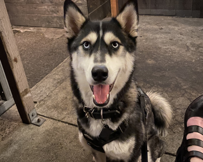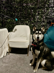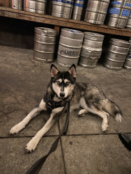 Siberian Husky w/ a heart of gold. Loves people, dogs, cuddles, belly rubs & life. Adventurous spirit & kind soul. Basso “Woo” = happy