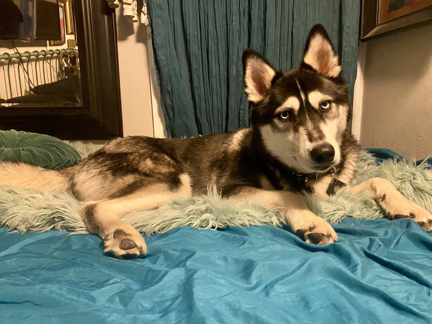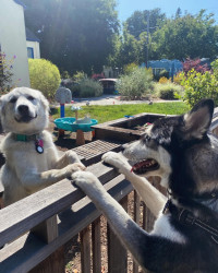 Tiburon makes everyone smile. He’s not only the most handsome boy w/ his ice blue eyes & dark mask, but he has an air of joy about him that’s contagious & is always smiling. From chasing bubbles in the sunshine to tossing up autumn leaves to jump after in the park, he’s always instigating play. It’s nearly impossible to be in a bad mood when he’s around! He’s the embodiment of happiness. And we’re about to start his journey as a therapy animal - taking him to people in need of his joyful heart!