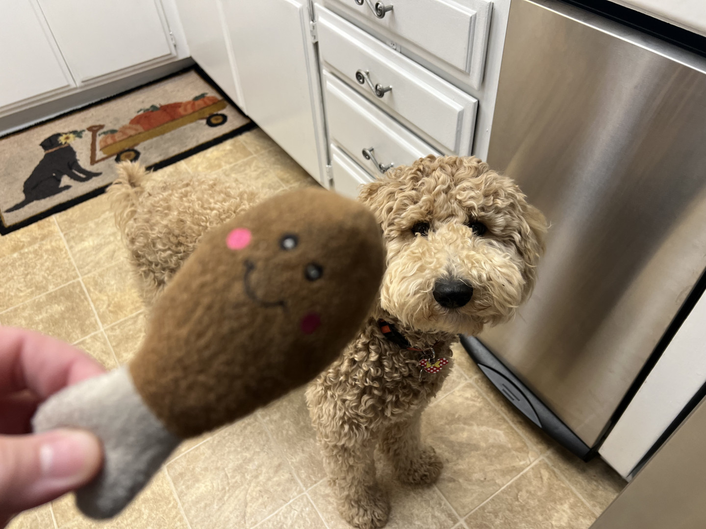Receive Text UpdatesHer favorite toy is her stuffed chicken leg. Every time I am cooking chicken, she brings it over to try and trade the stuffed chicken for the real thing.