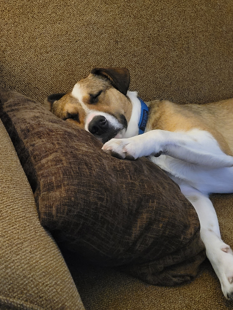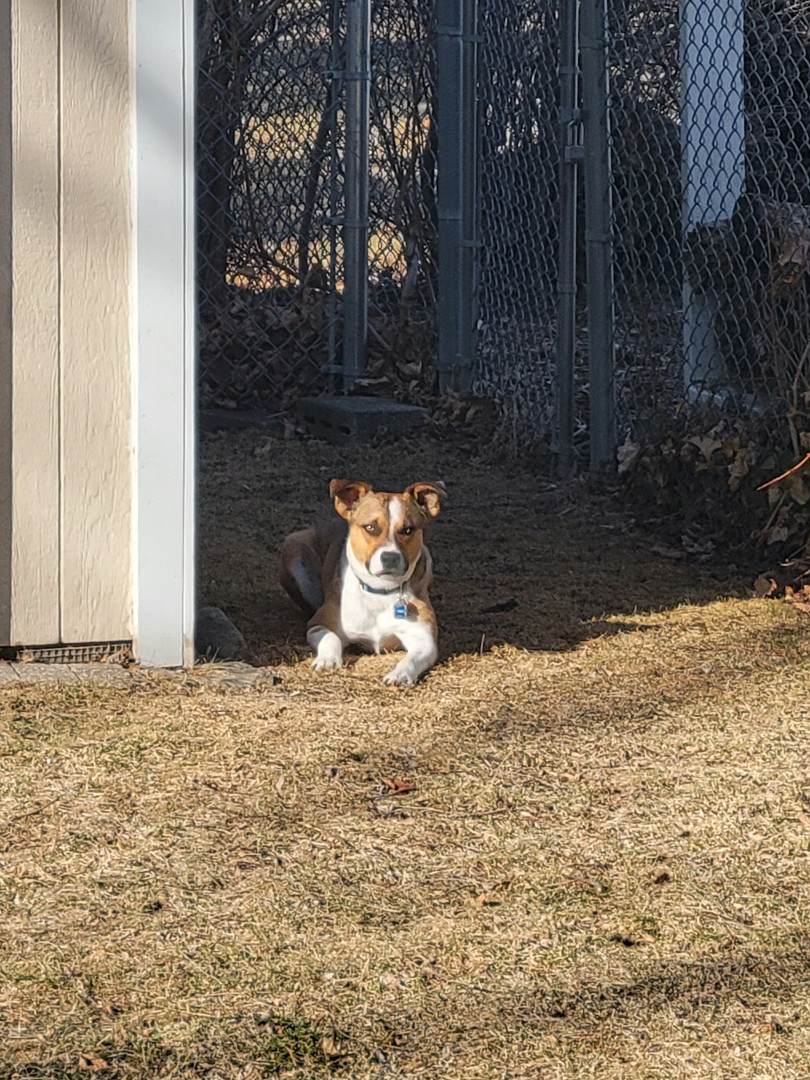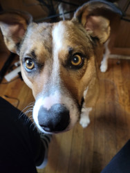 1 year old Timber was found running the woods in Missouri with 4 other dogs. A mix of everything from Border Collie to Boston Terrier.
