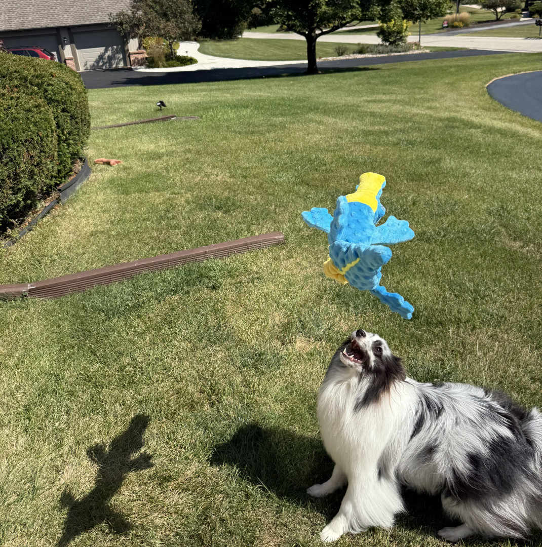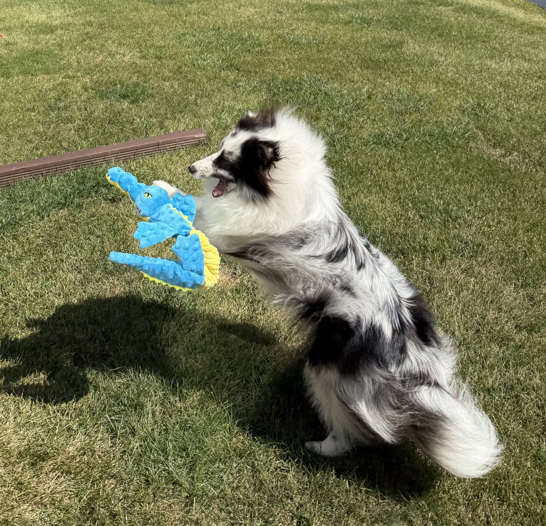 Tina loves a tennis ball or a long tug toy. She likes to run around with it in her mouth shaking it and growling. She loves jerky treats or freeze dried beef liver treats. Eating is her favorite part of the day! Her ears perk up when you ask if she is hungry! She listens amazingly well for treats or food