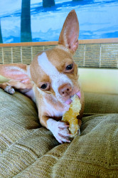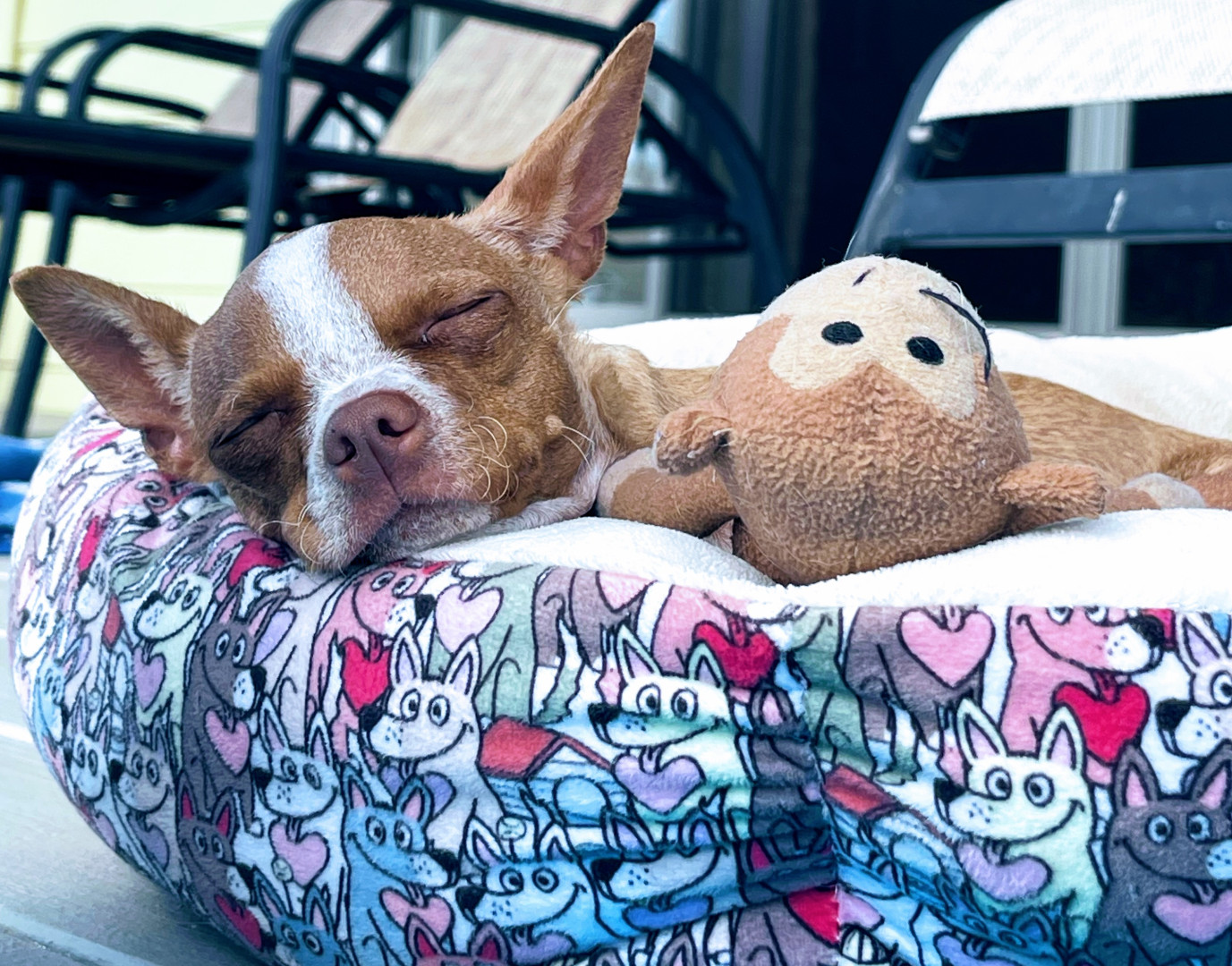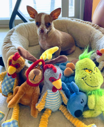 Tina’s personality is much larger than she is so her favorite toys are also much larger than her; she has two chickens that she can’t even carry but chooses to drag them around as best she can or cuddles with them in her many beds. Her favorite treat (other than rotisserie chicken like most dogs) is a sweet treat sold in our local Costco called Bocce’s Bakery Campfire S’mores for dogs!
