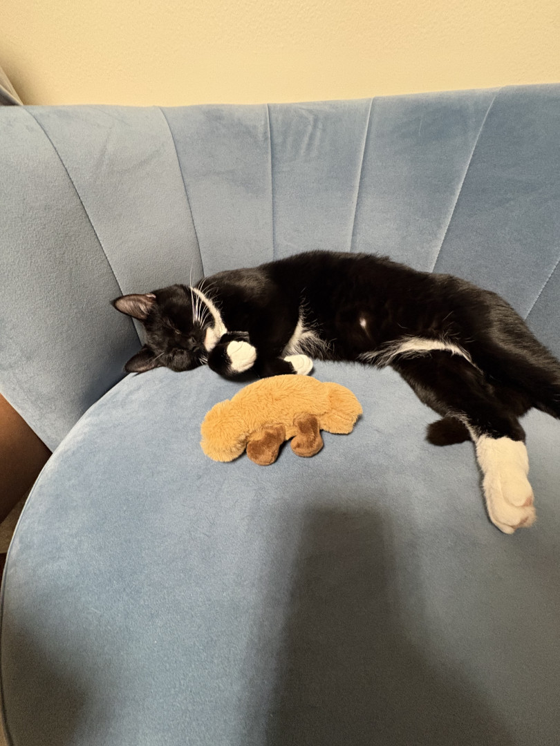 Tiny’s favorite toy is a small stuffed croissant with a mustache in little legs. Whether it’s cuddling with it or trying to tear it to shreds, he will choose nothing else to play with. As for go to treat, he loves paw-pops. Paw-pops are catnip and turkey flavor Christmas trees on a stick.