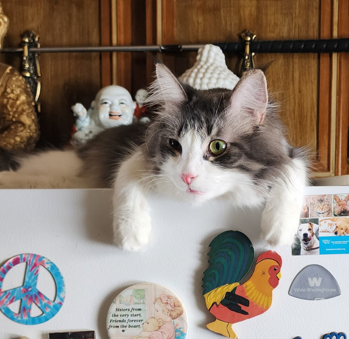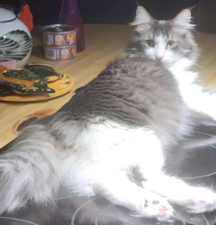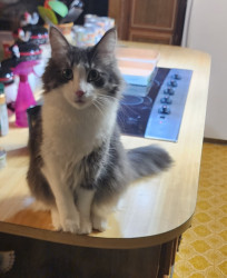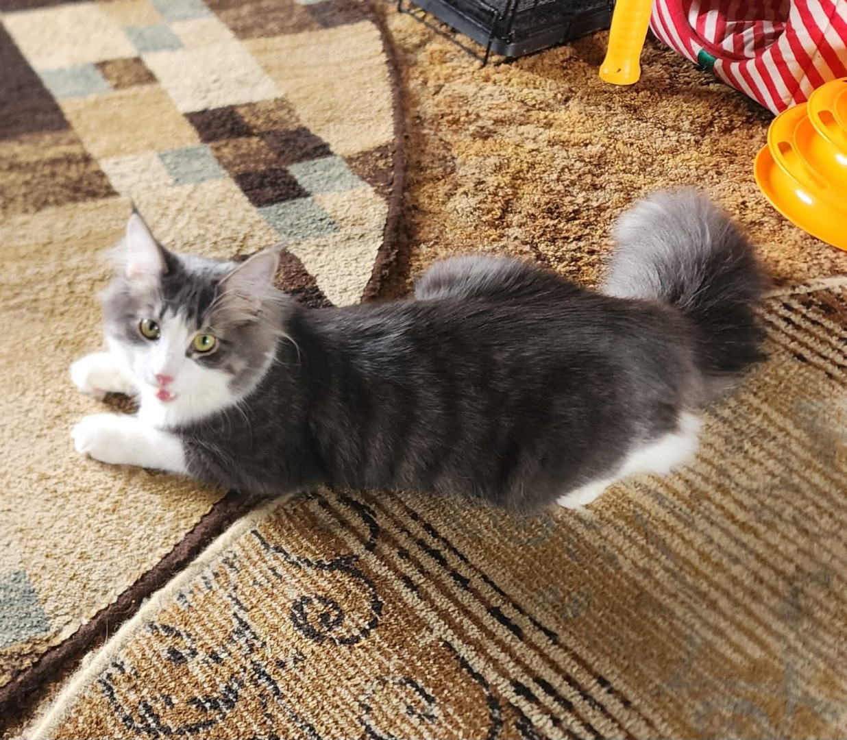 Fluffy whiteand gray with a big fluffy tail.Part Maine Coon with boundless energy and the life of the party.