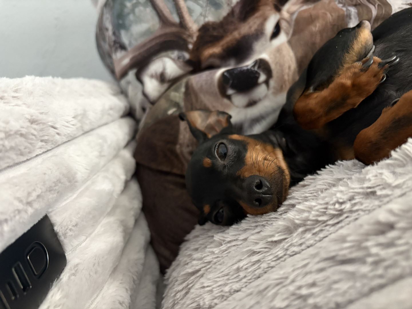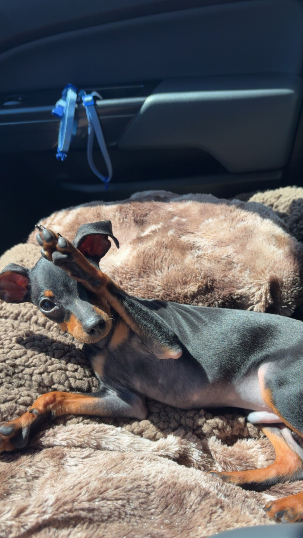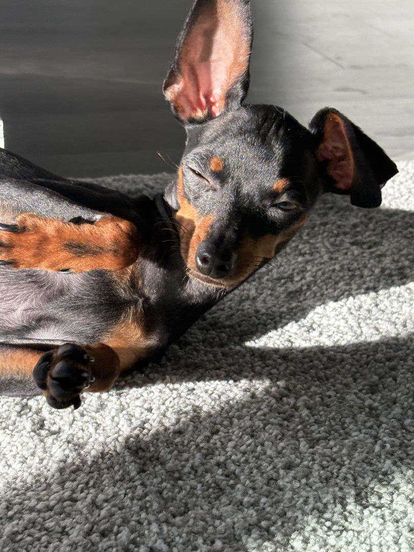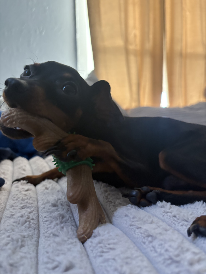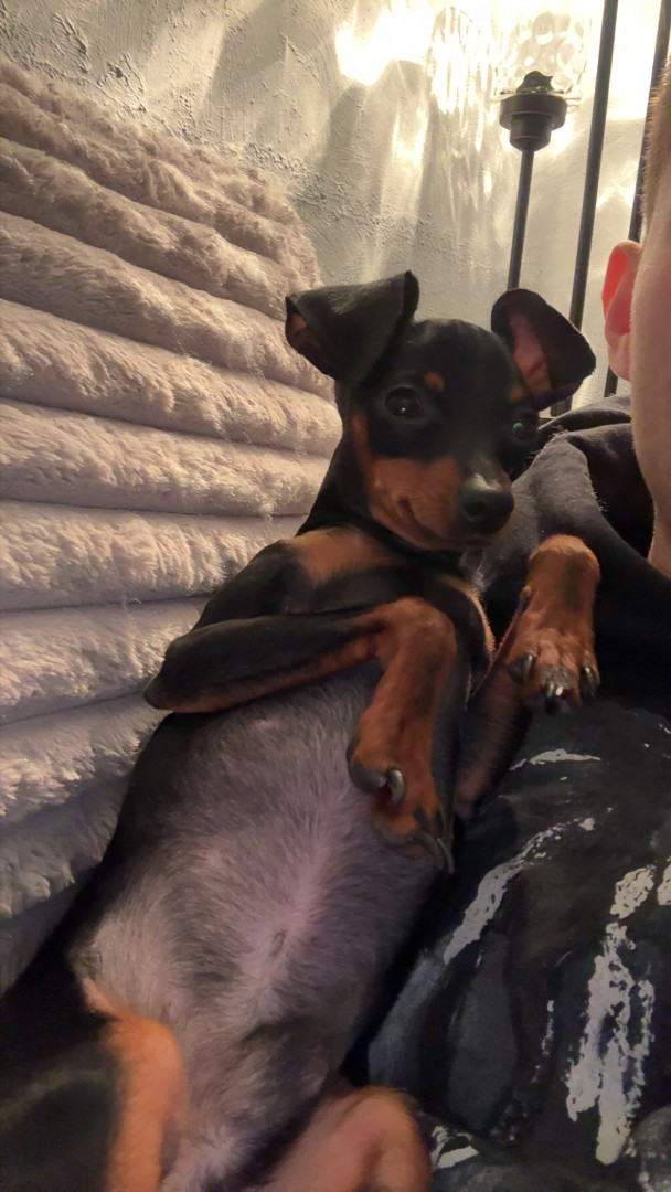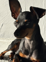 Mommas boy, energetic, cuddly, 3.5 pounds, mini pincher, very smart!