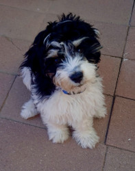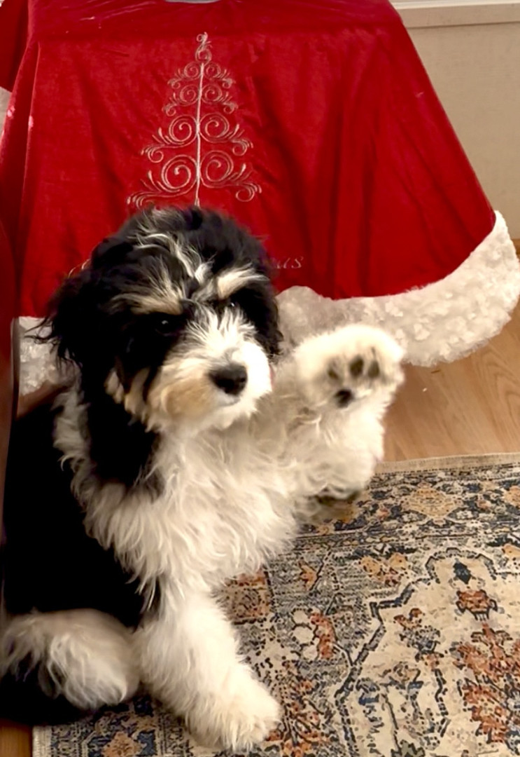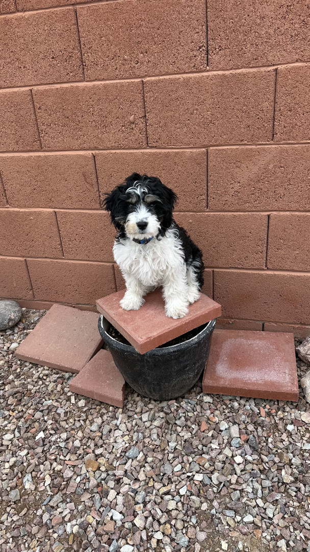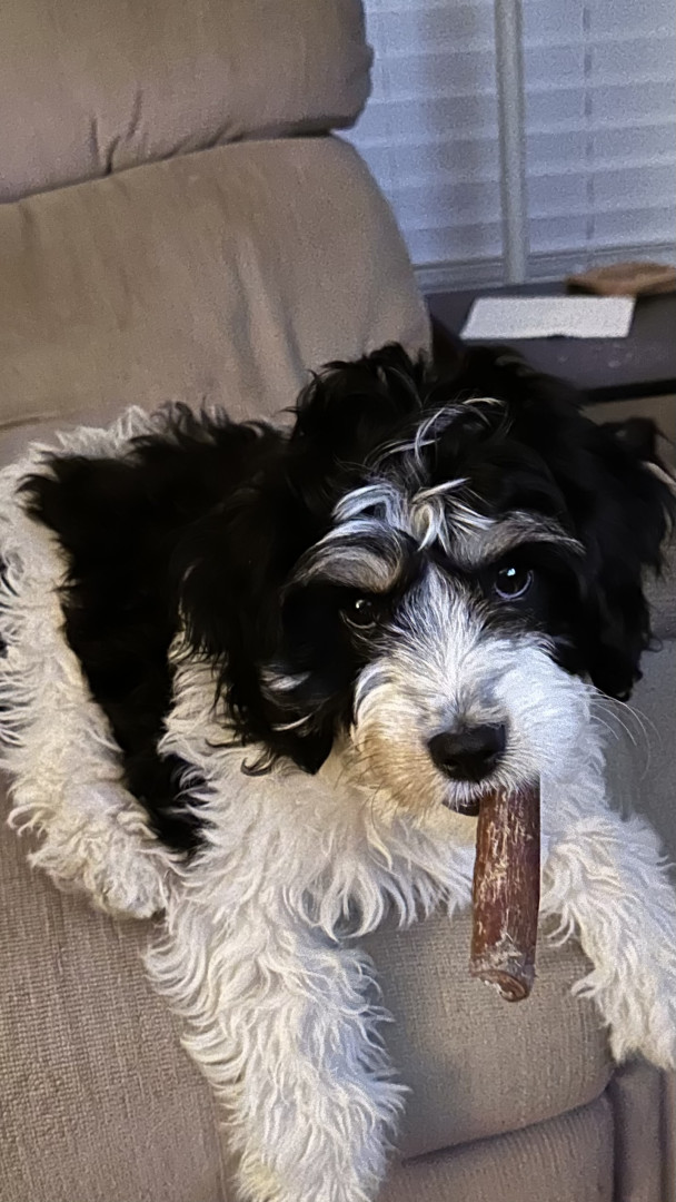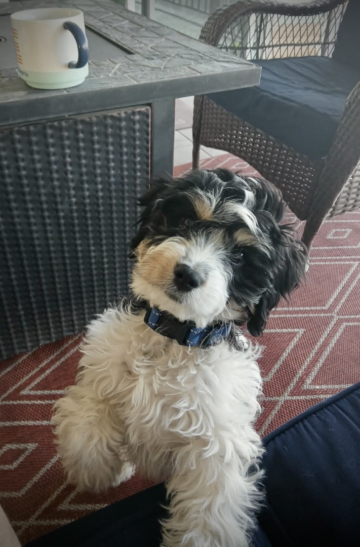 Toby is a charming Cavachon whose personality at 5 months old wins the hearts of the neighbors who pass by our front porch.