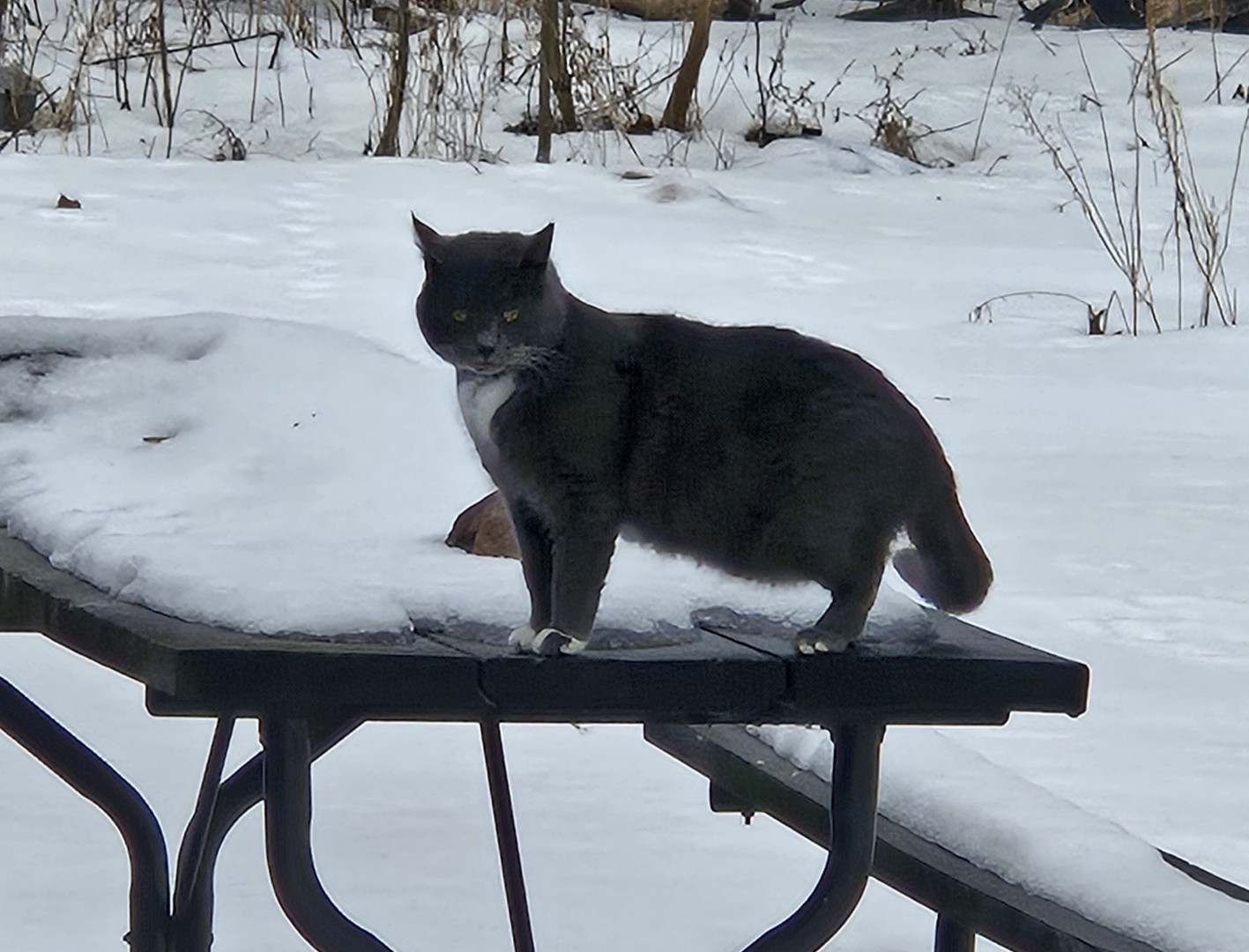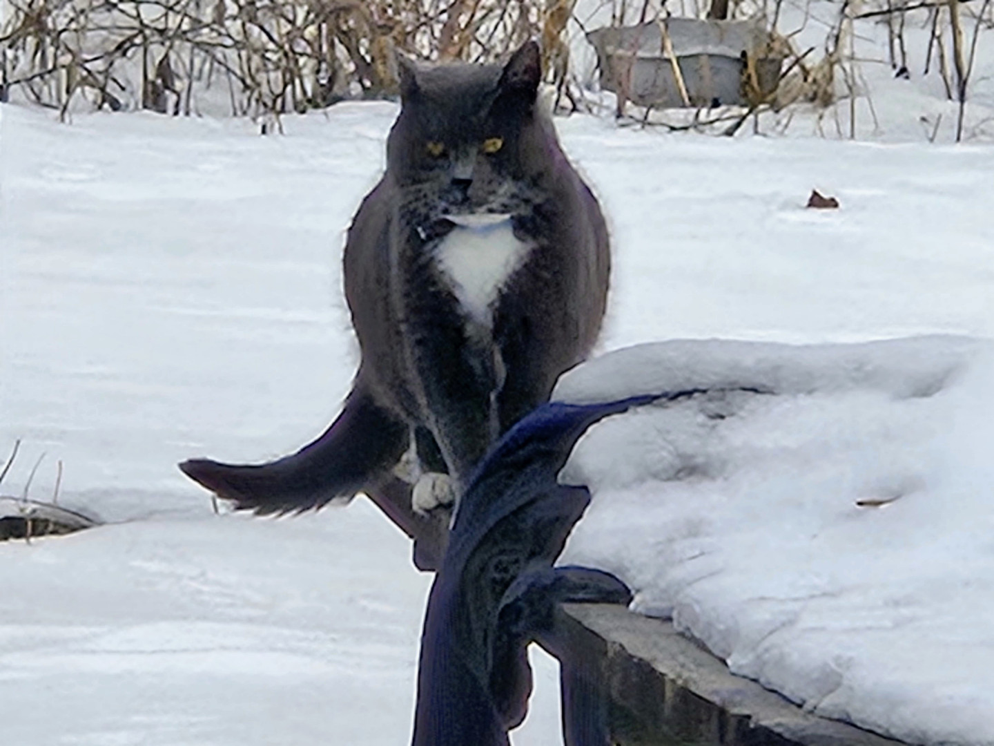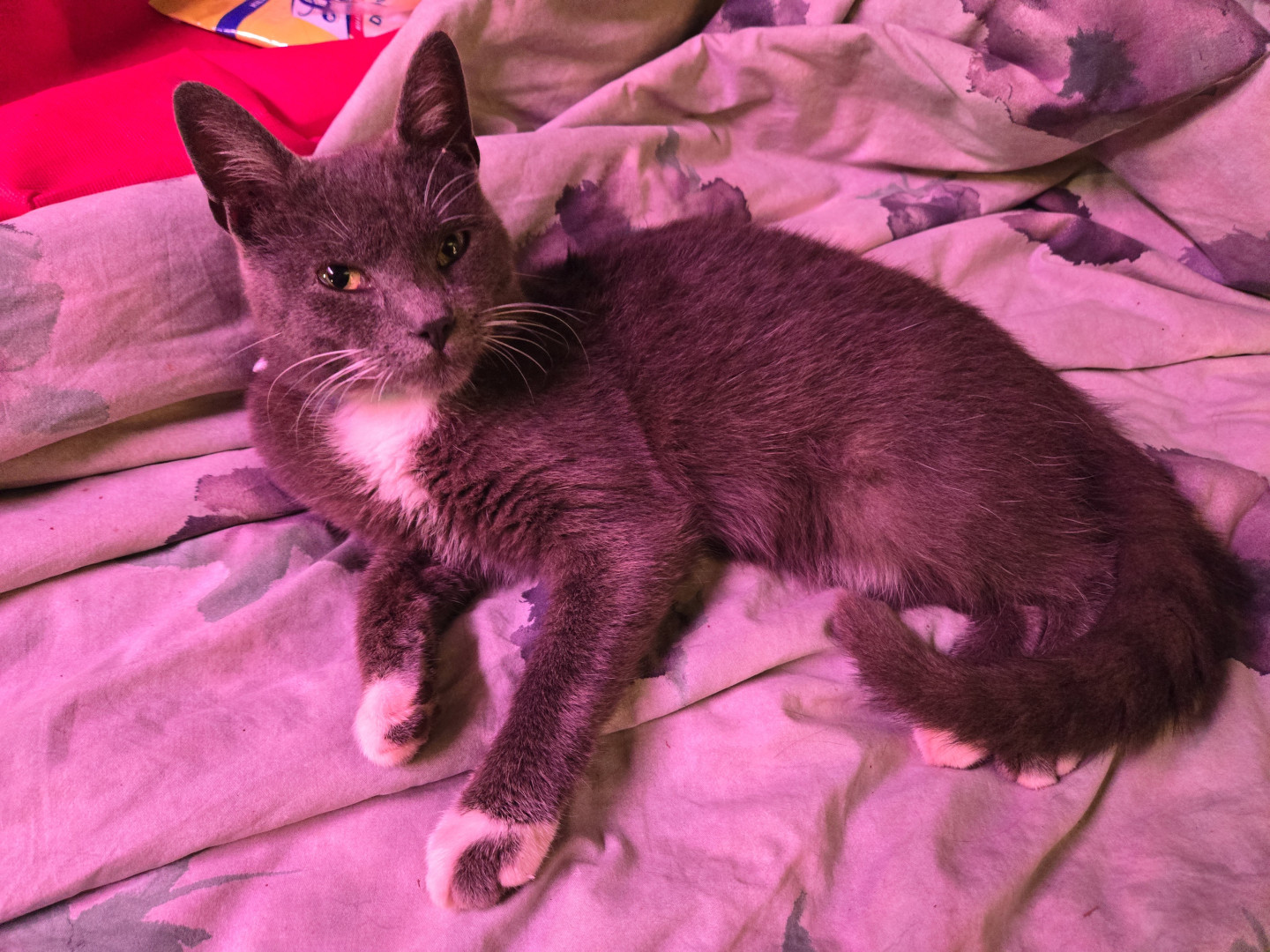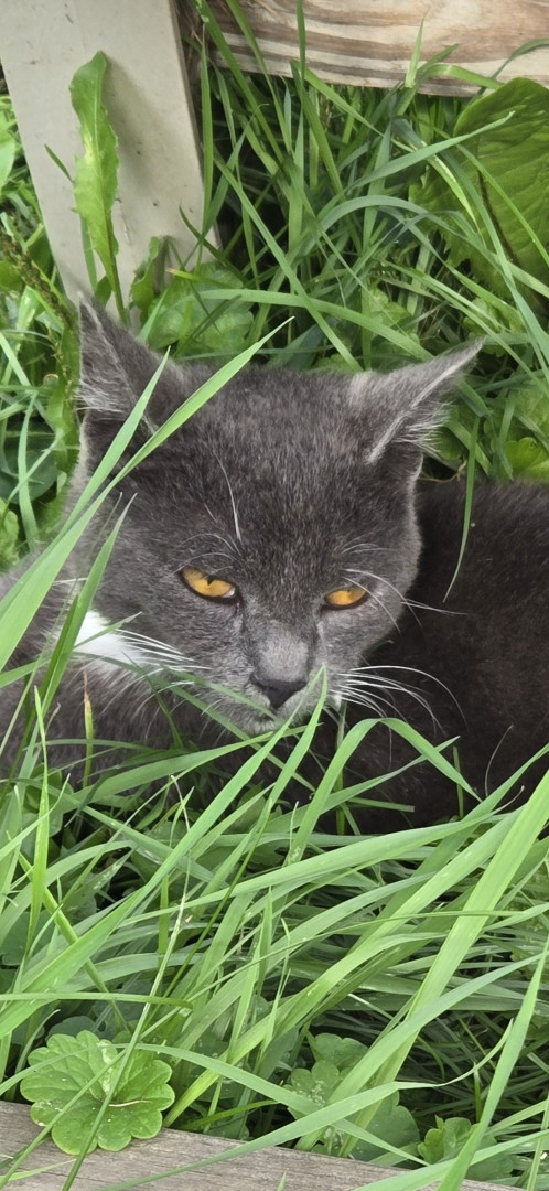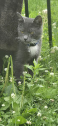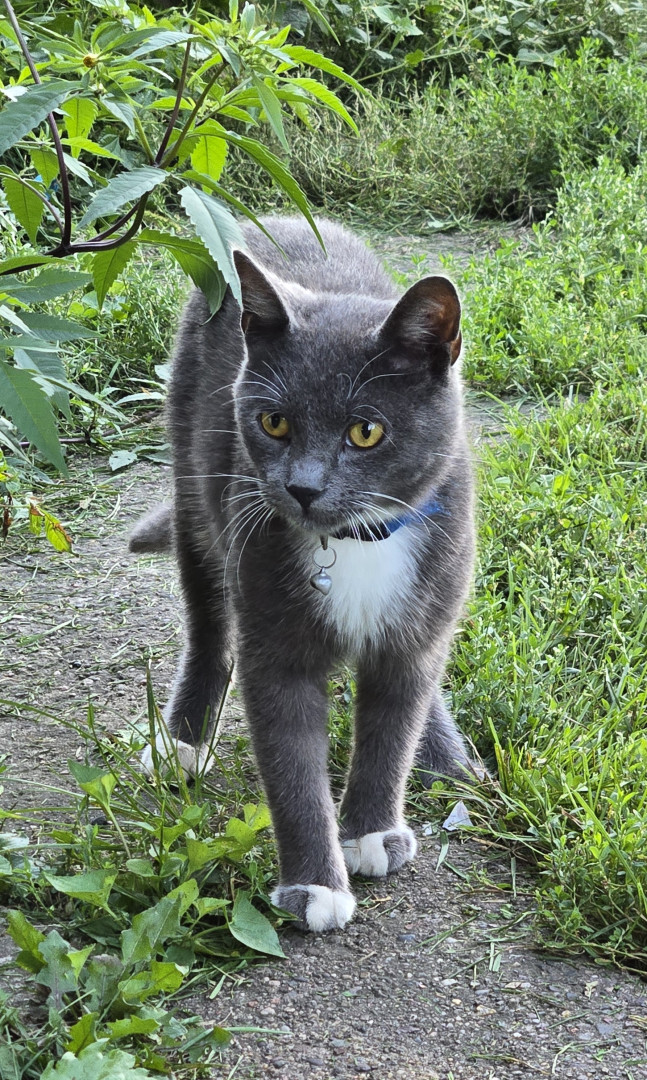 He has 1 gray toe on each white foot. That's how he got his name. And he has beautiful golden-orange eyes.