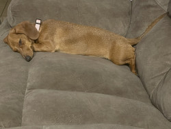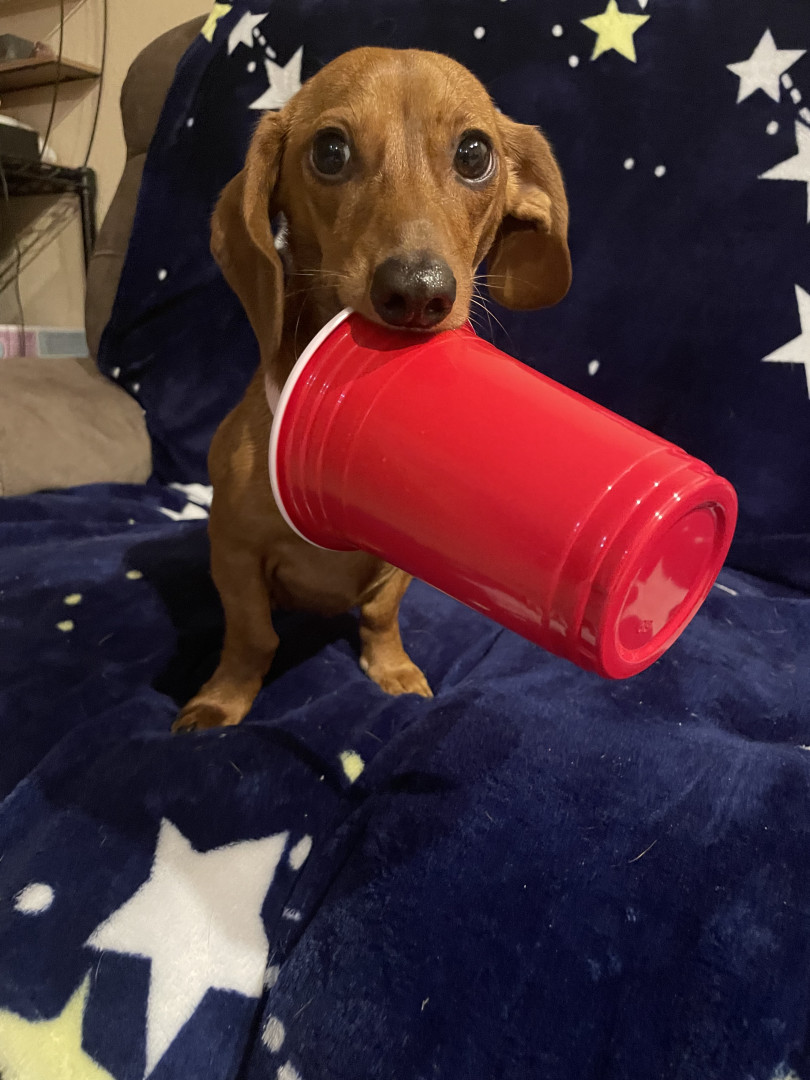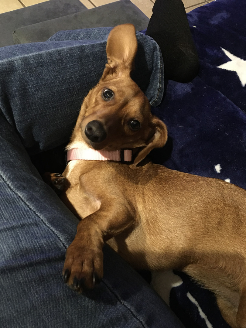 Tootsie is a miniature dachshund weighing 9.5 pounds. She is mischievous and stubborn, but so perfect and we love her dearly.