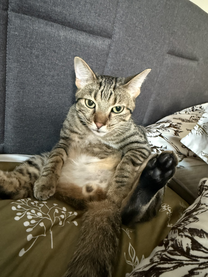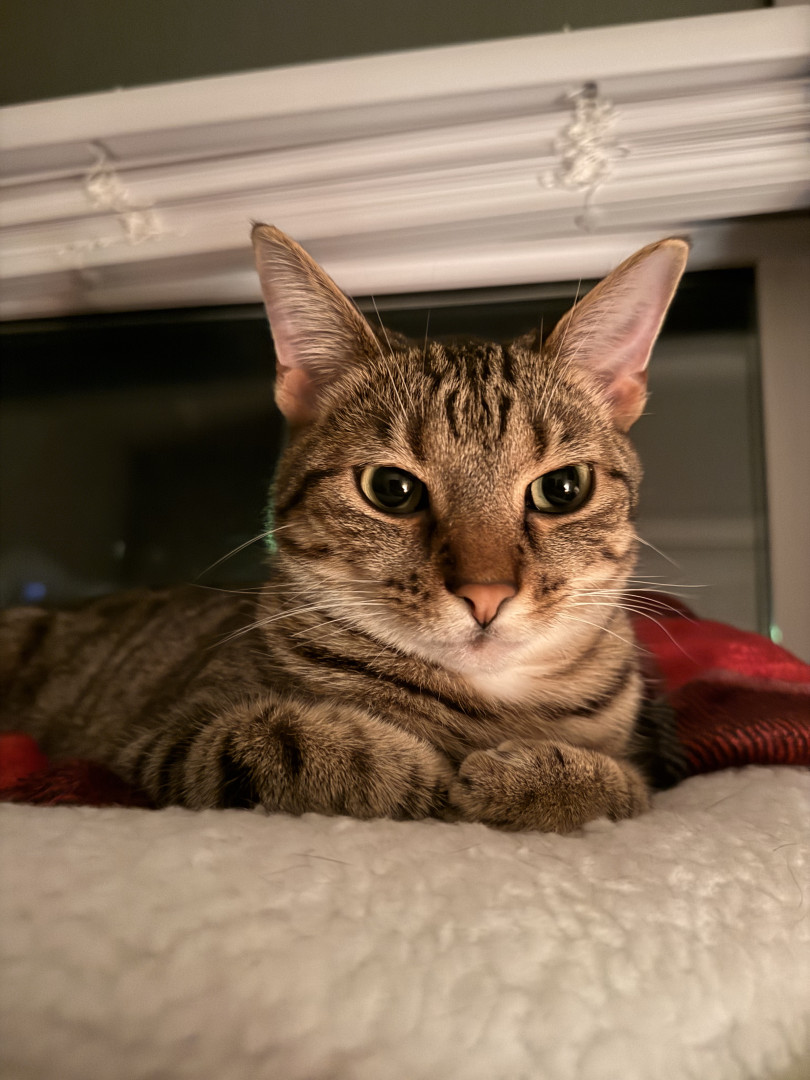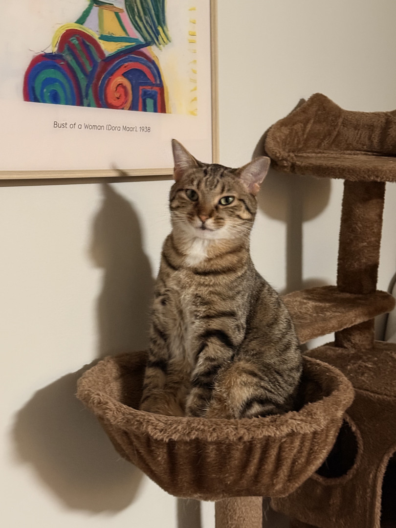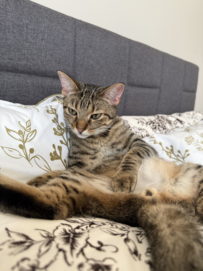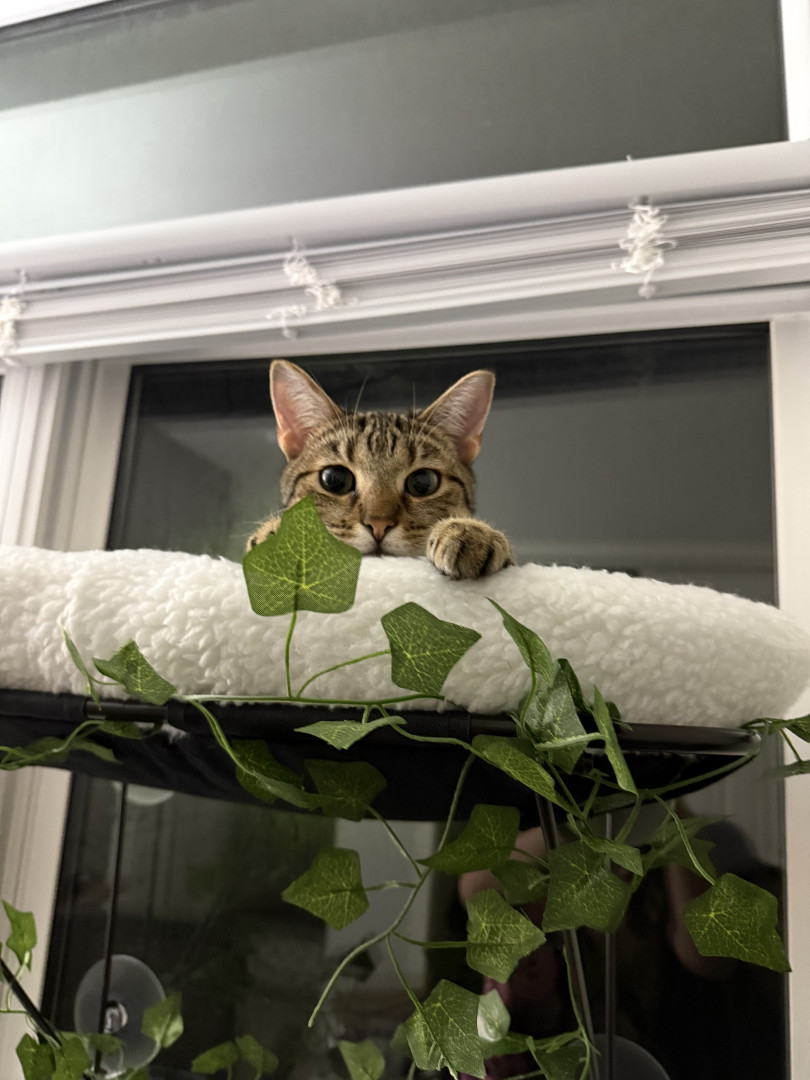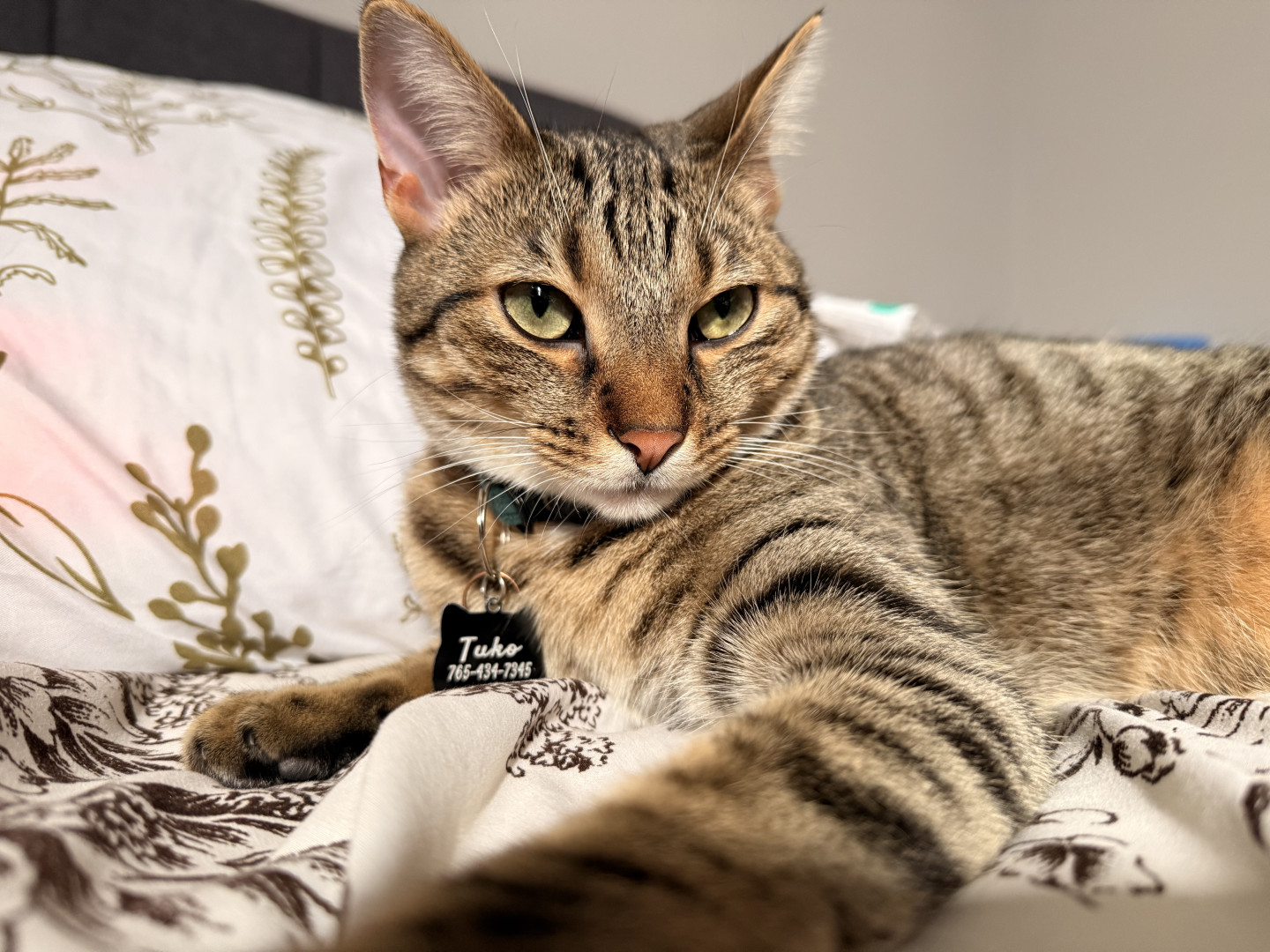 Tuko’s most unique quality would be his human like qualities. He loves watching tv with us, opens cabinets, watches me cook, sits at the dinner table with us, answers when his name is called, sits with me in the bathroom, has conversations with me, understands “sit” and “shake”, says hello when people come in the door by going to his mushroom scratching post and taking a big stretch, and overall just needing to be apart of everything. His personality is filled with surprises:)