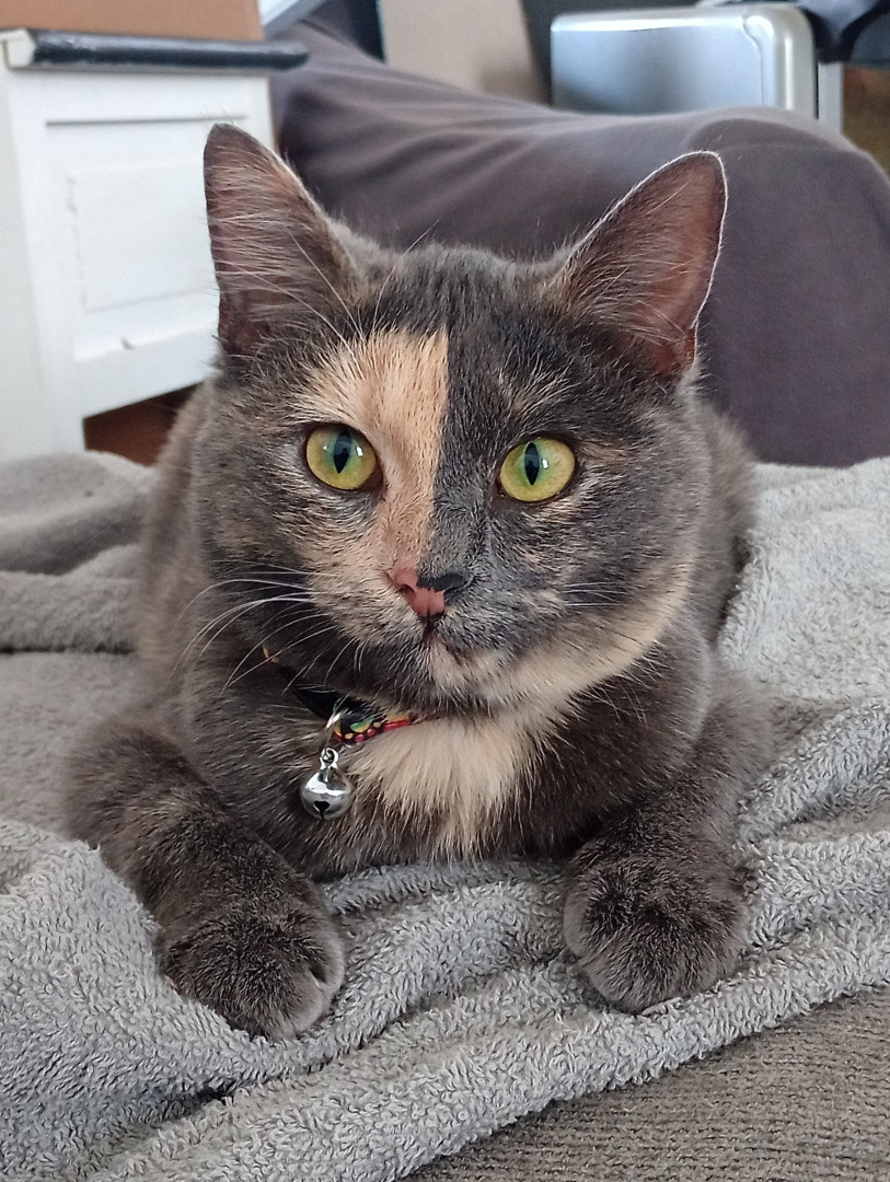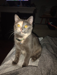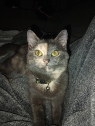 Tuna is unique.. as a stray kitten she would run from neighbor to neighbor house.. when I'd walk outside, she would try to run inside my house. Tuna is a talker, she meows alot and just loves get into everything.. Tuna unique facial colors looks like 2 faces depending on her mood. Loves to love nibble to show her affection..