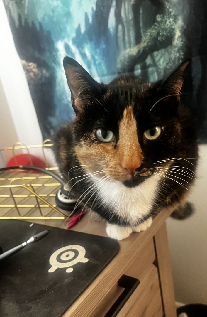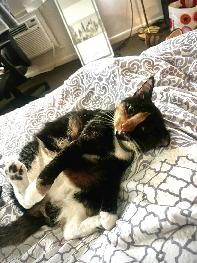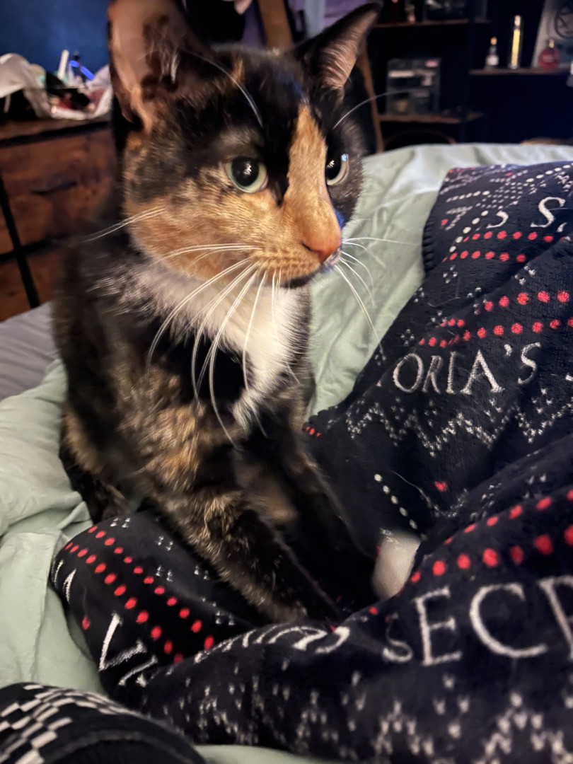 Twinken is a chatty, friendly, and cuddly 6-year-old Torti who loves the outdoors and poses like a pro—my photogenic adventure buddy. 🐾