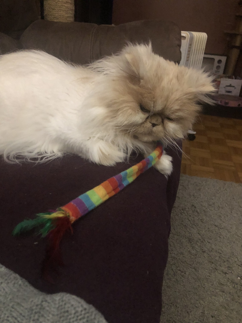 Tygrr is adorably ferocious đŸ˜¹. His favourite toy is a rainbow coloured snake with a pom head and feathers at the end of the tail! Every day Tyggs drags that snake around. I love to whirl and sway it for him. He jumps as high in the air as he can to catch it! Once he’s caught it he shakes it’s head and feariciously meows in victory! He especially loves to eat Griller canned cat food!