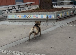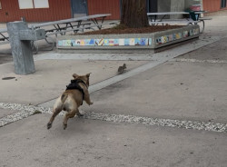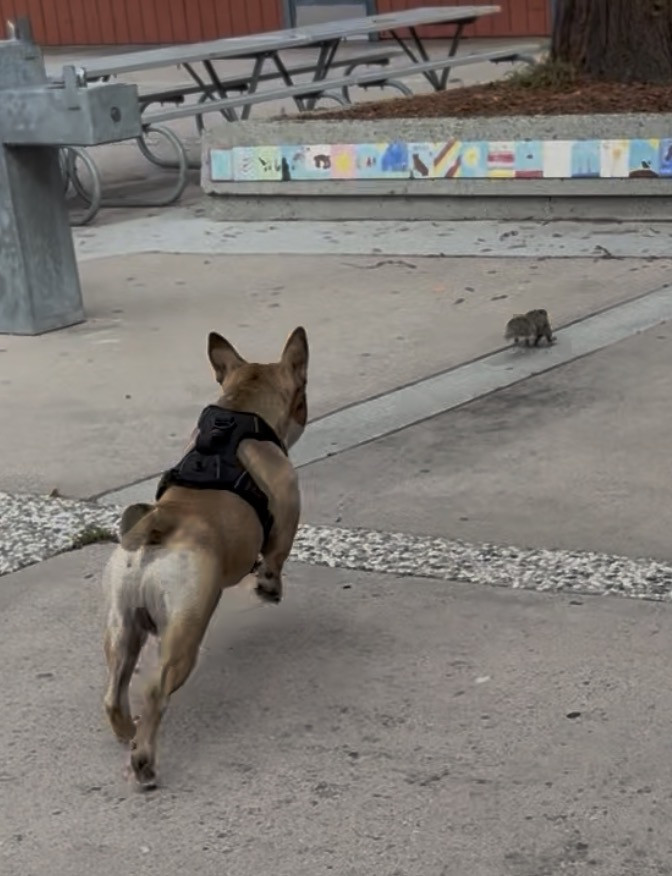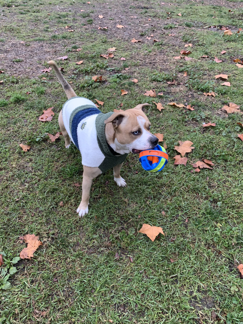 Tyson has a very strong prey drive for squirrels and we have dozens of squirrels in our neighborhood. Because of these facts, Tyson's absolute #1 favorite toy is the 'Squwhirl' by Wobble Wag. It is a frisbee like flat disc toy that is designed to look like a squirrel and has whistles for eyes. It's amazing creators made the perfect toy for a dog that has a lot of energy and loves to chase critters. With enough space and thrown correctly, this toy will continue rolling until Tyson catches it!