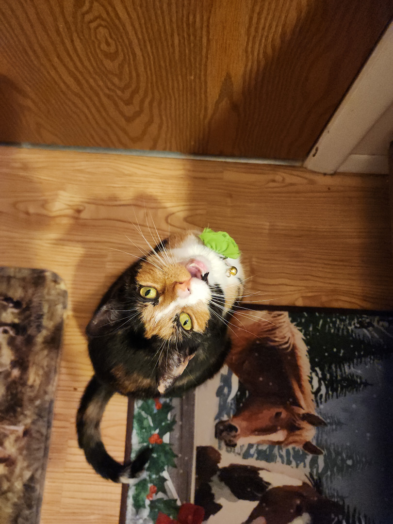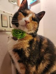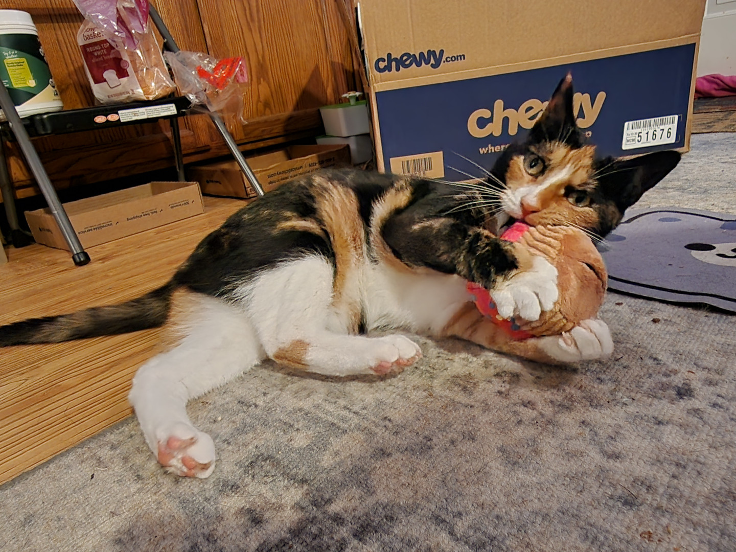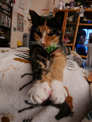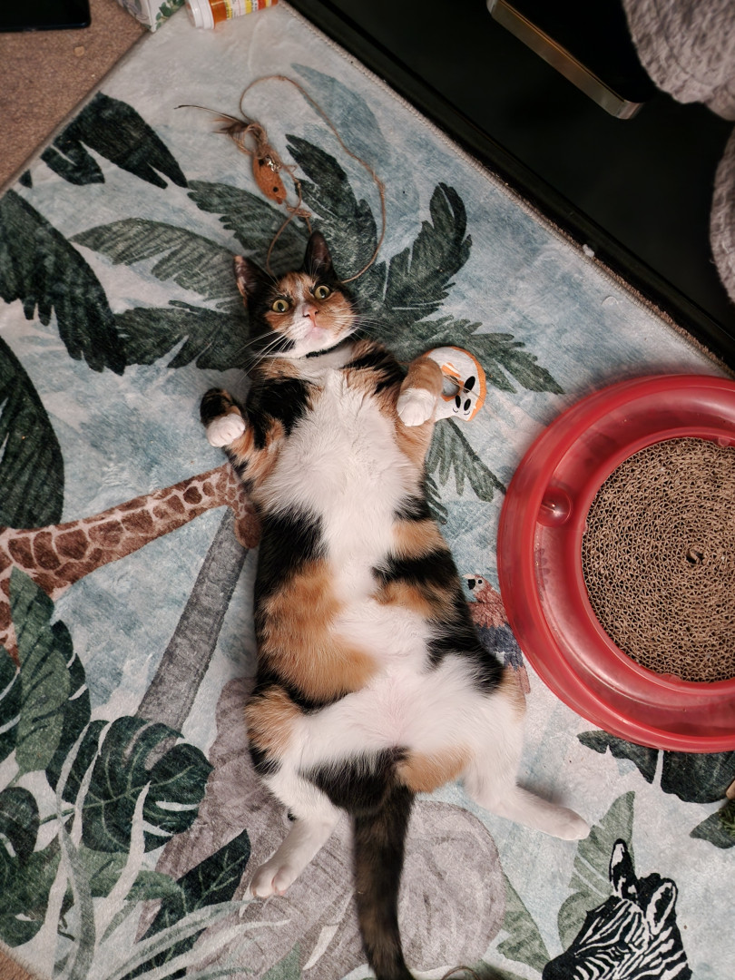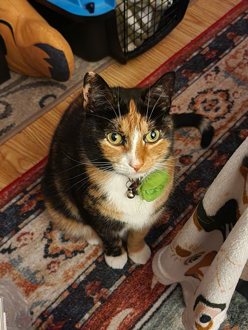 Velvet really loves strings with feathers tied to them! She also loves springs a lot! Churu is her absolute favorite treat. She brings her toy to her human to tell him it's time for tube!
