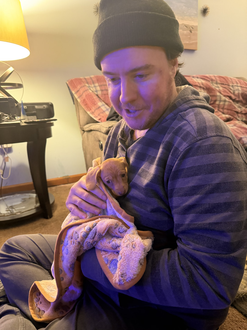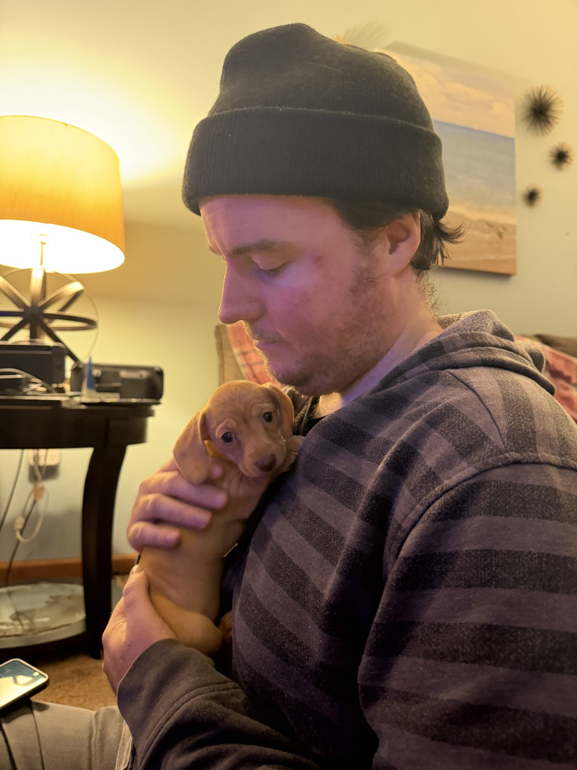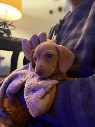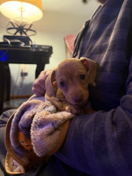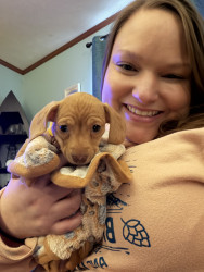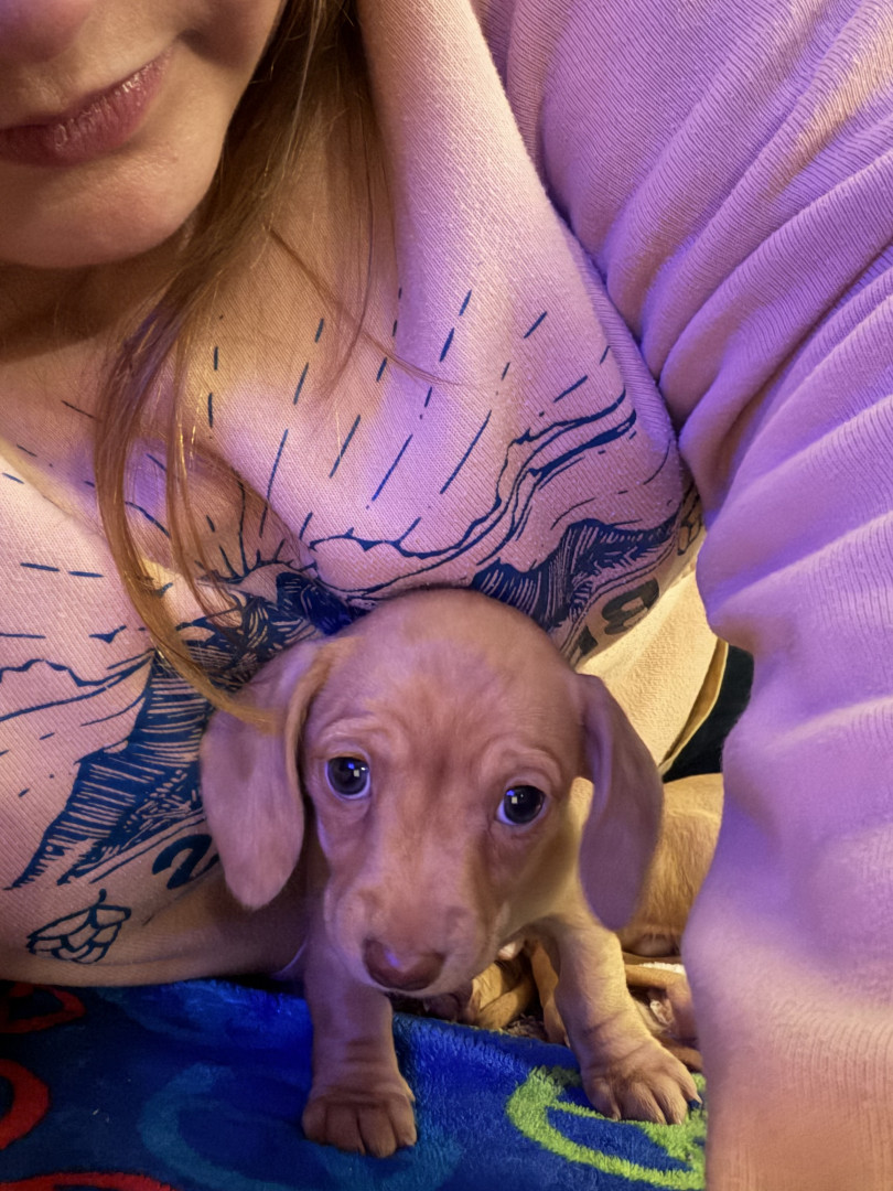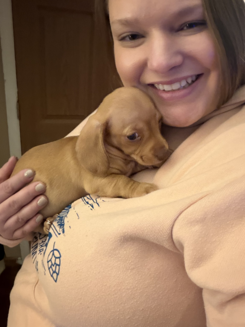 Vienna is a mini dachshund & only 8 weeks old! She might be the smallest in her litter, but is the first to the food & full of personality