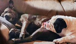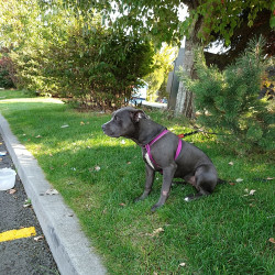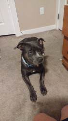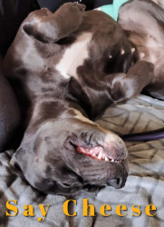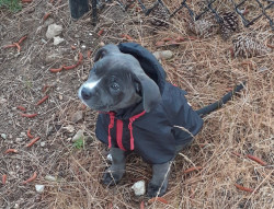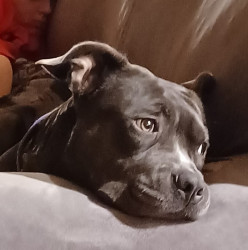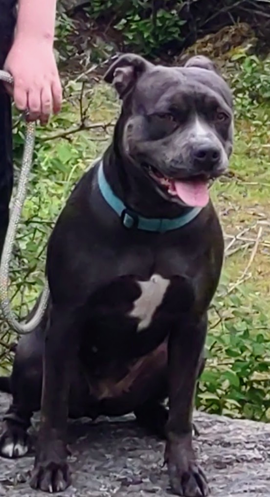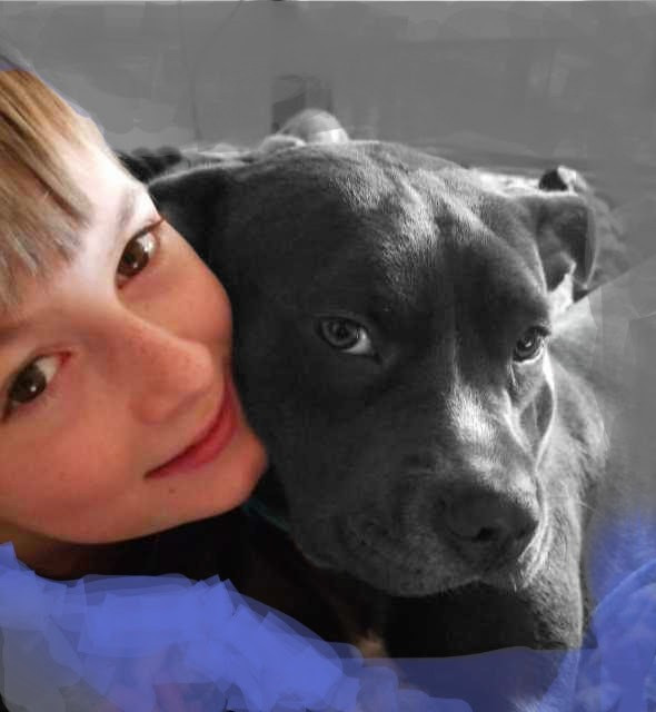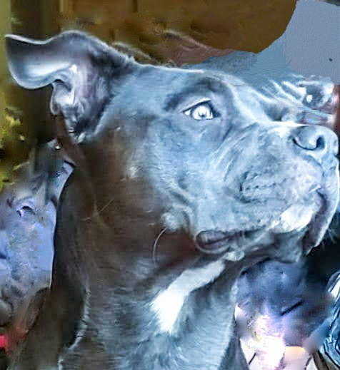 Viddy who is characterized as a "furious protector" despite being a "big baby" that acts like a lap dog, even at 70 pounds.