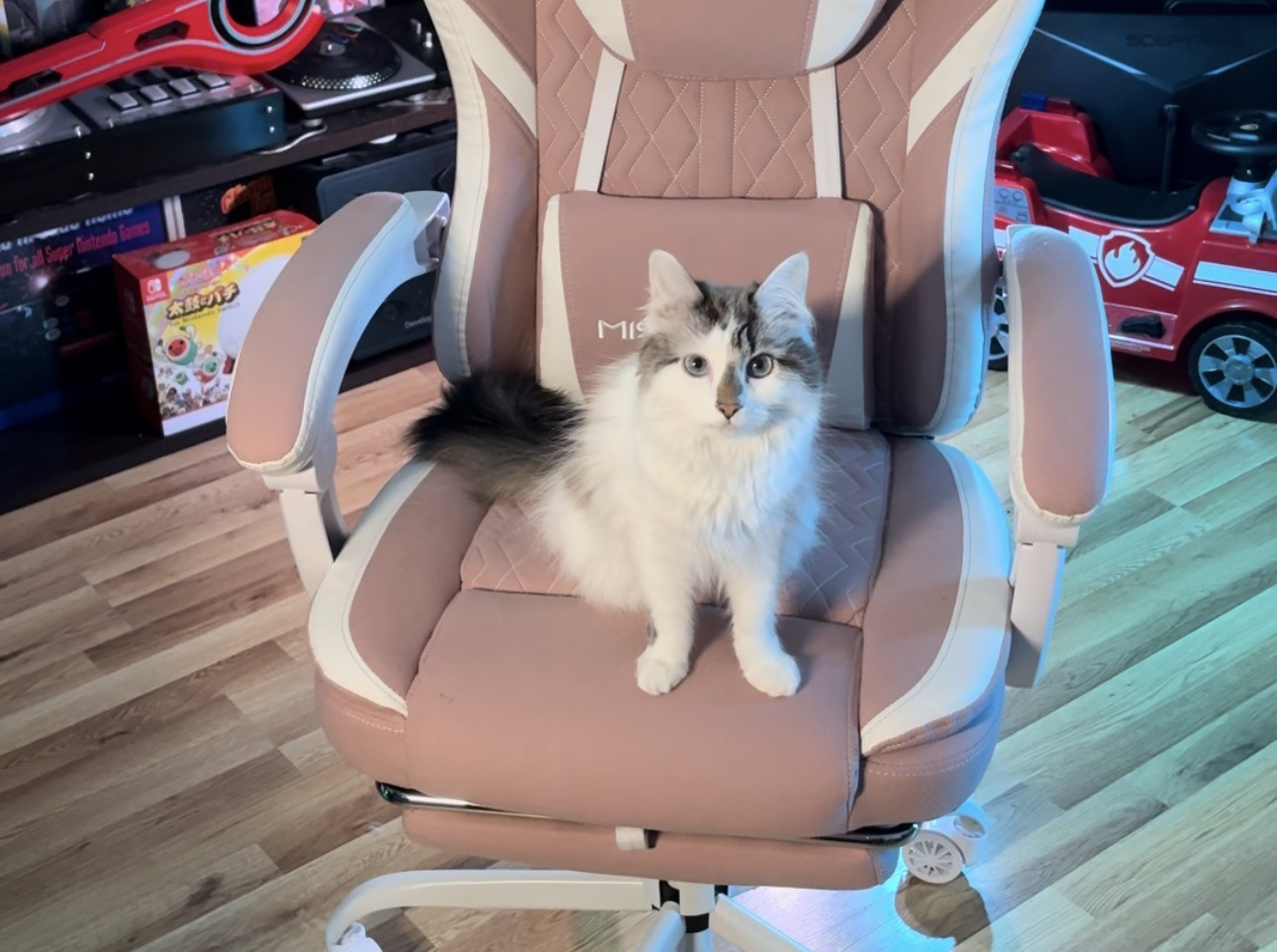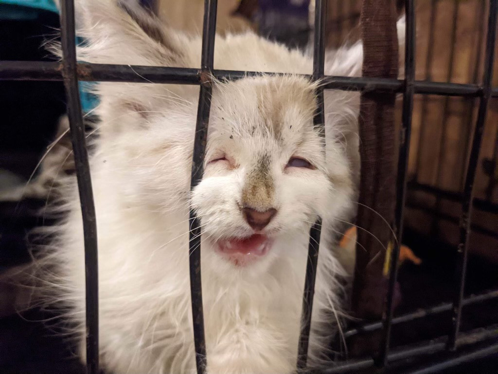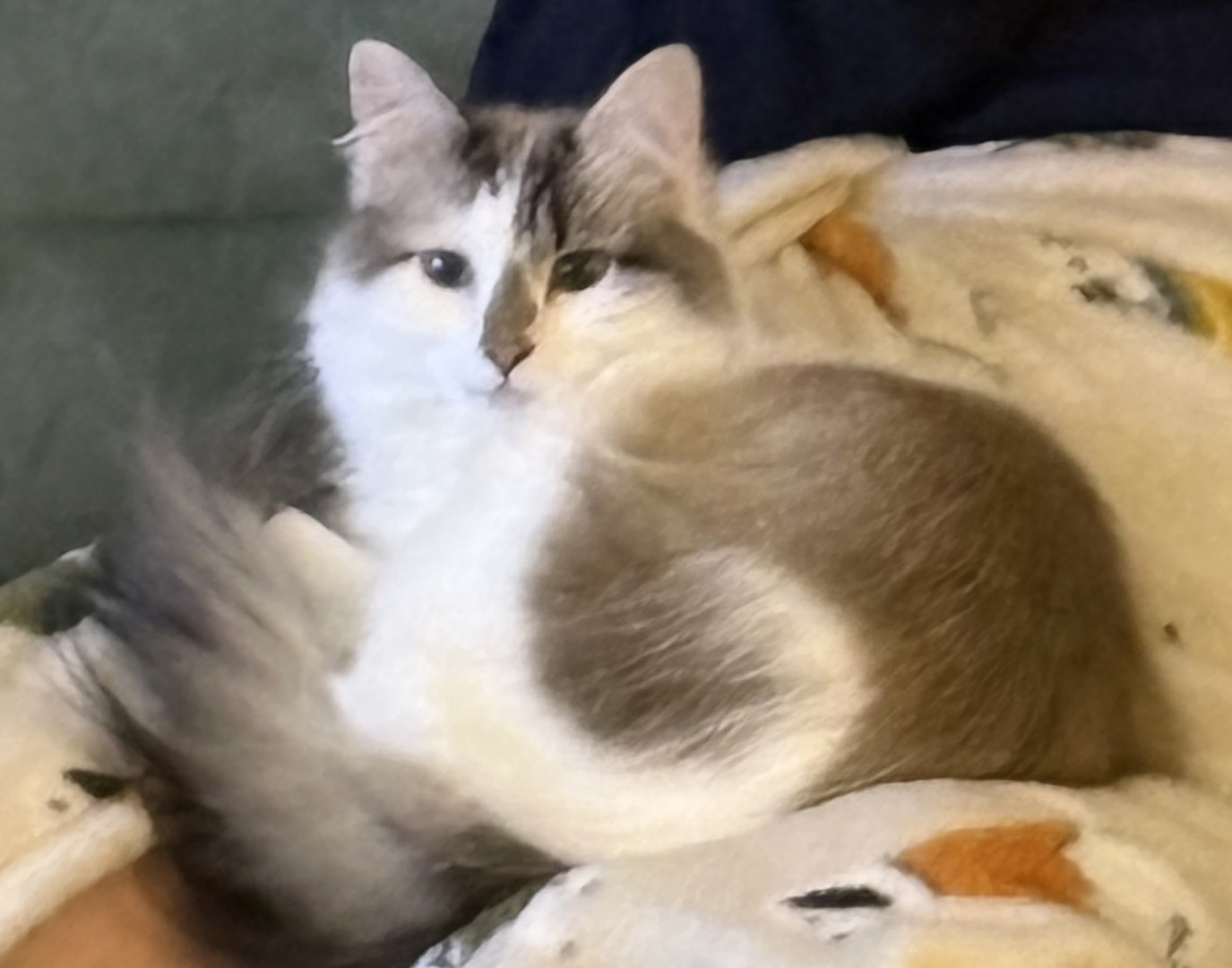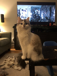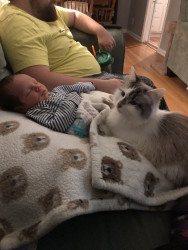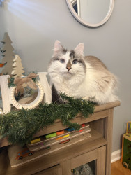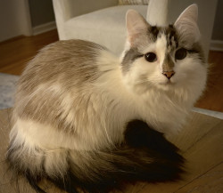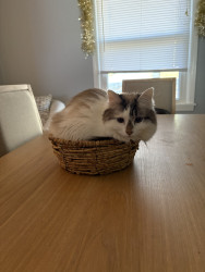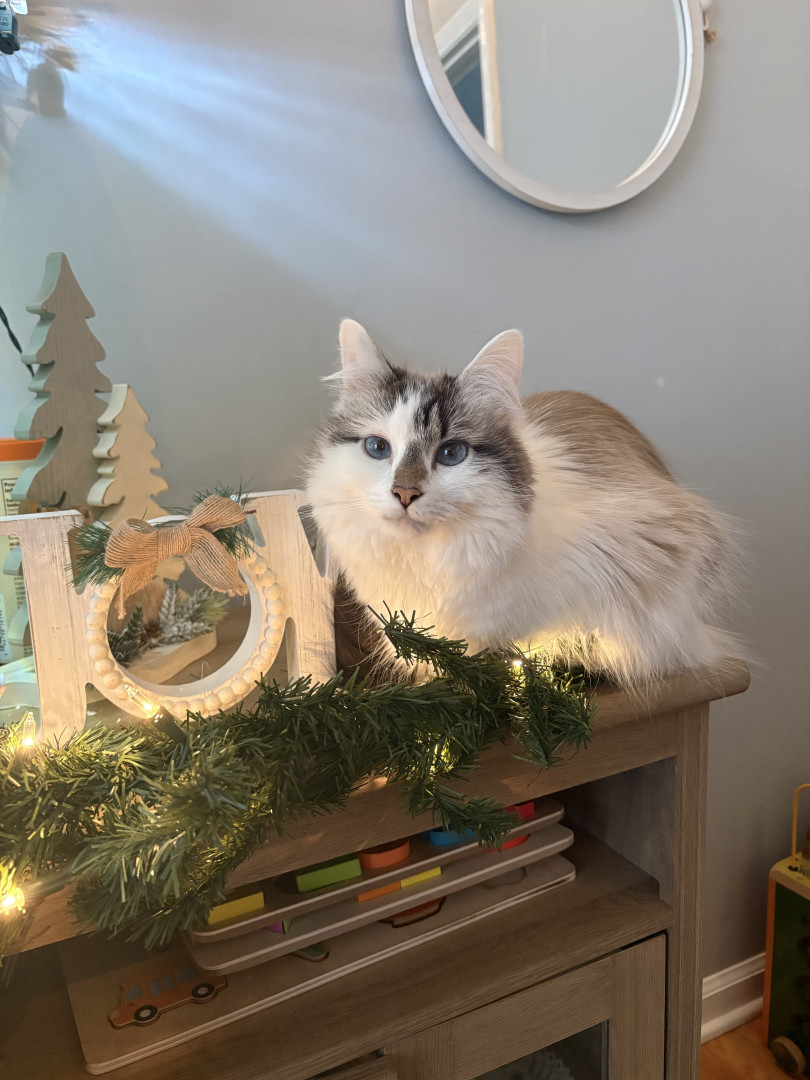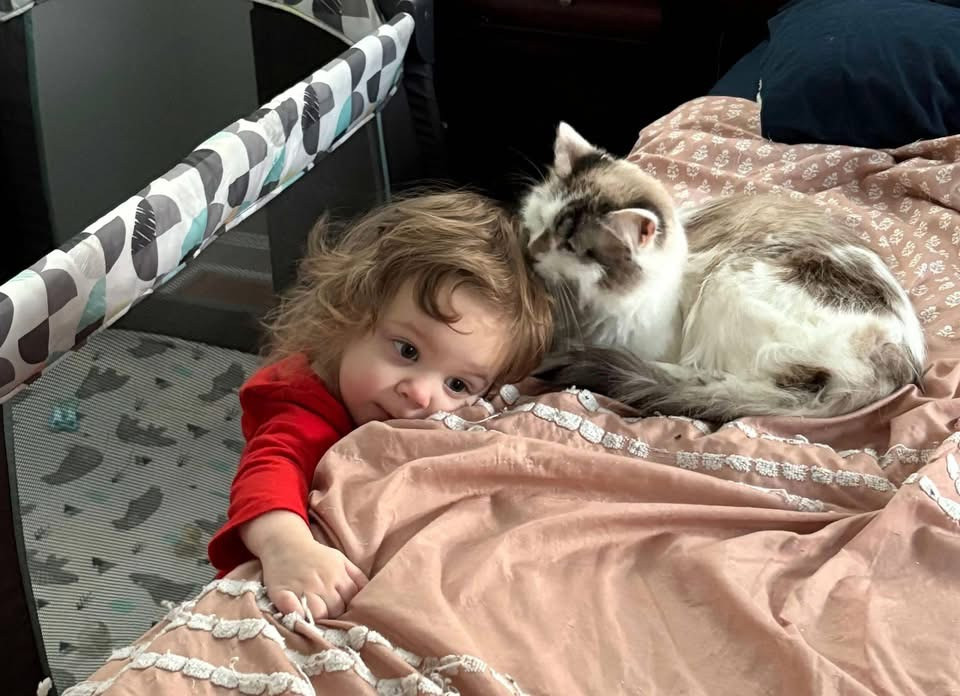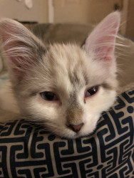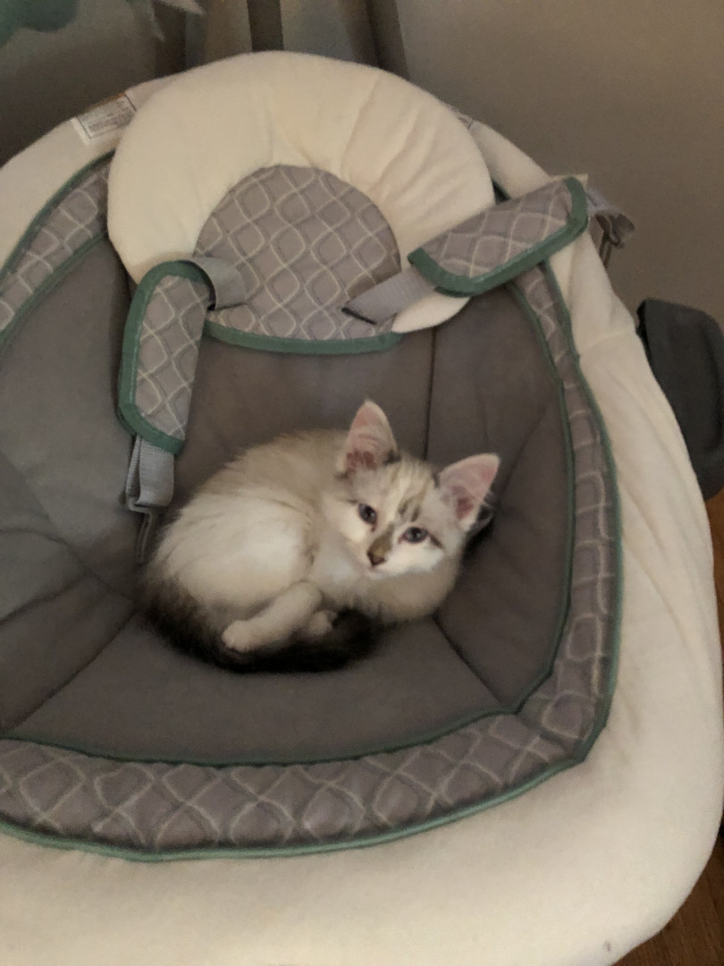 She was a stray being attacked by chickens at barely 8 weeks old. We ended up keeping her and she’s such a small sweet cat with our kids.