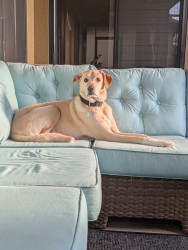 Waggs has a sweet and old soul. He loves to meet the people and when Mommy takes him on adventures in the car. He's a guardian farm dog.