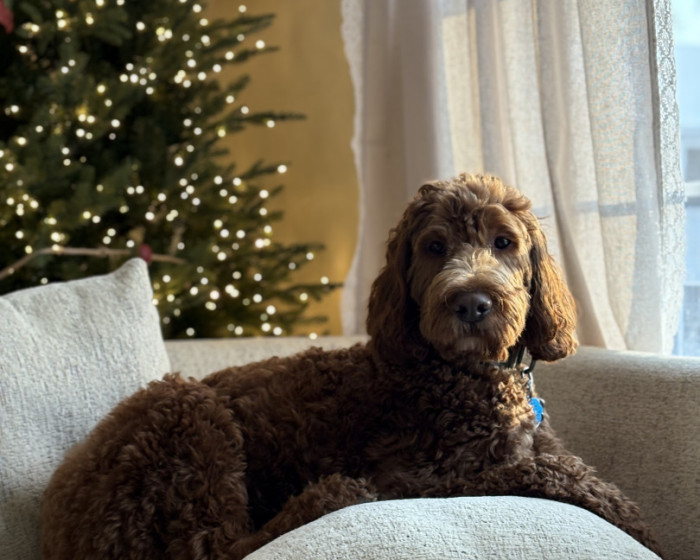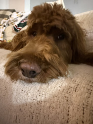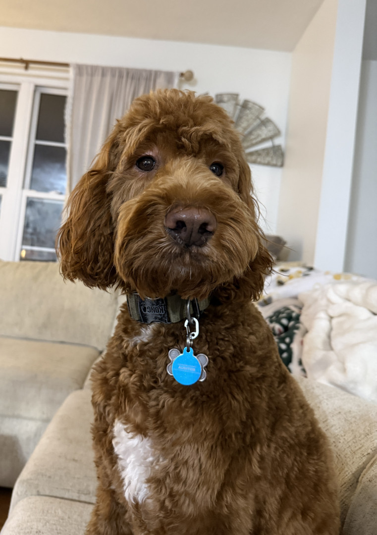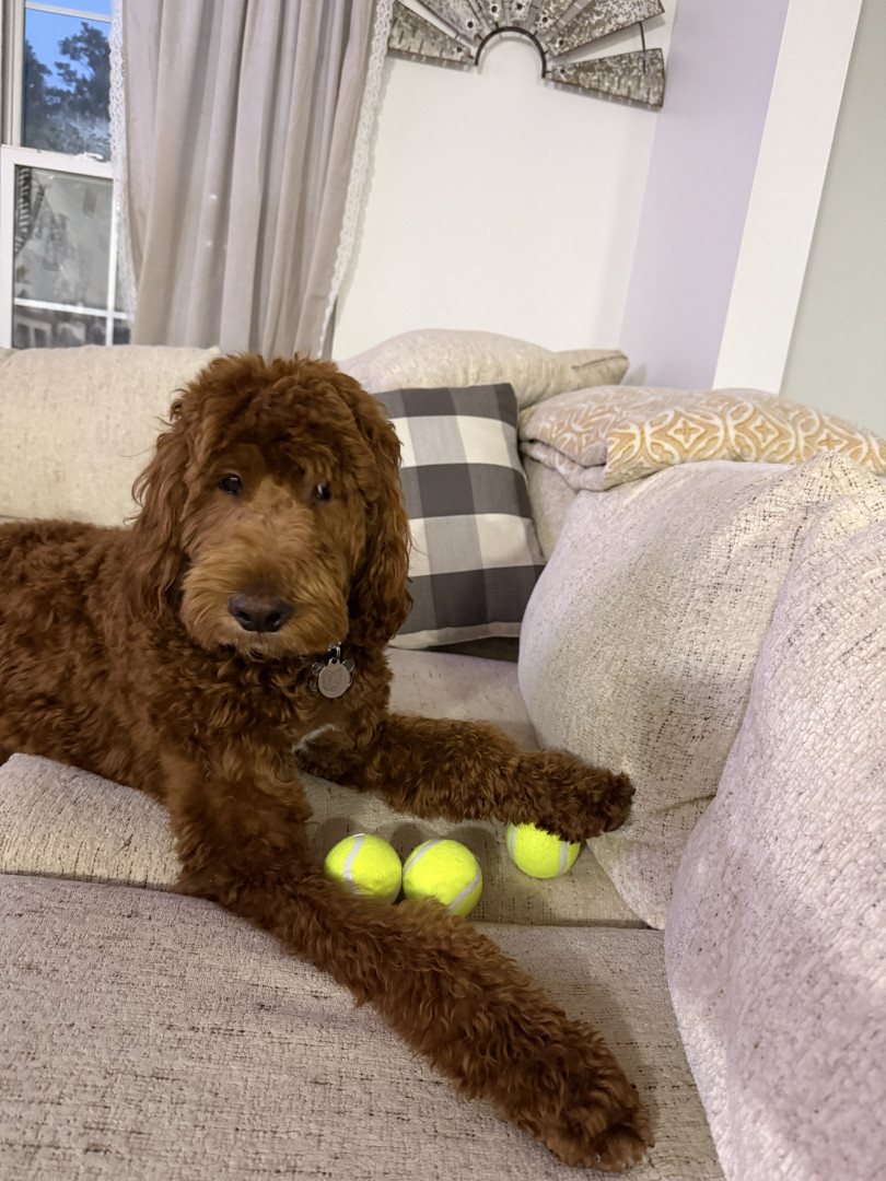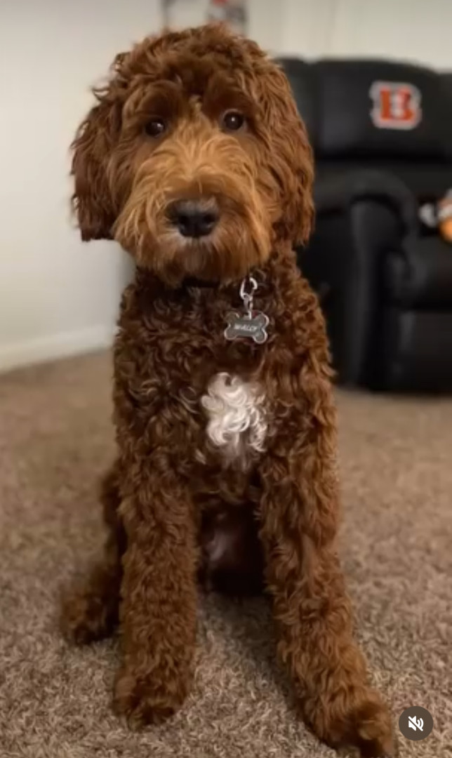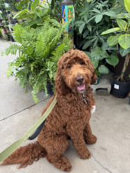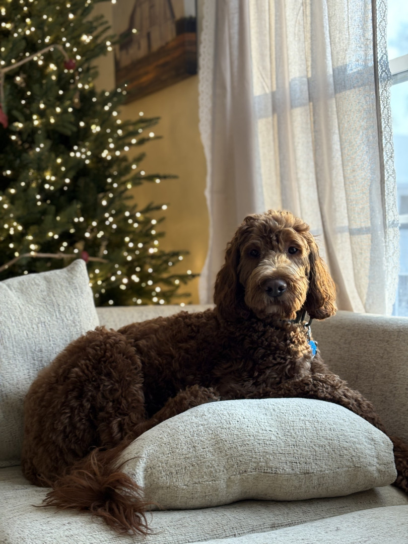 Irish Setter Poodle mix who is the epitome of joy. This dog knows he’s a star!