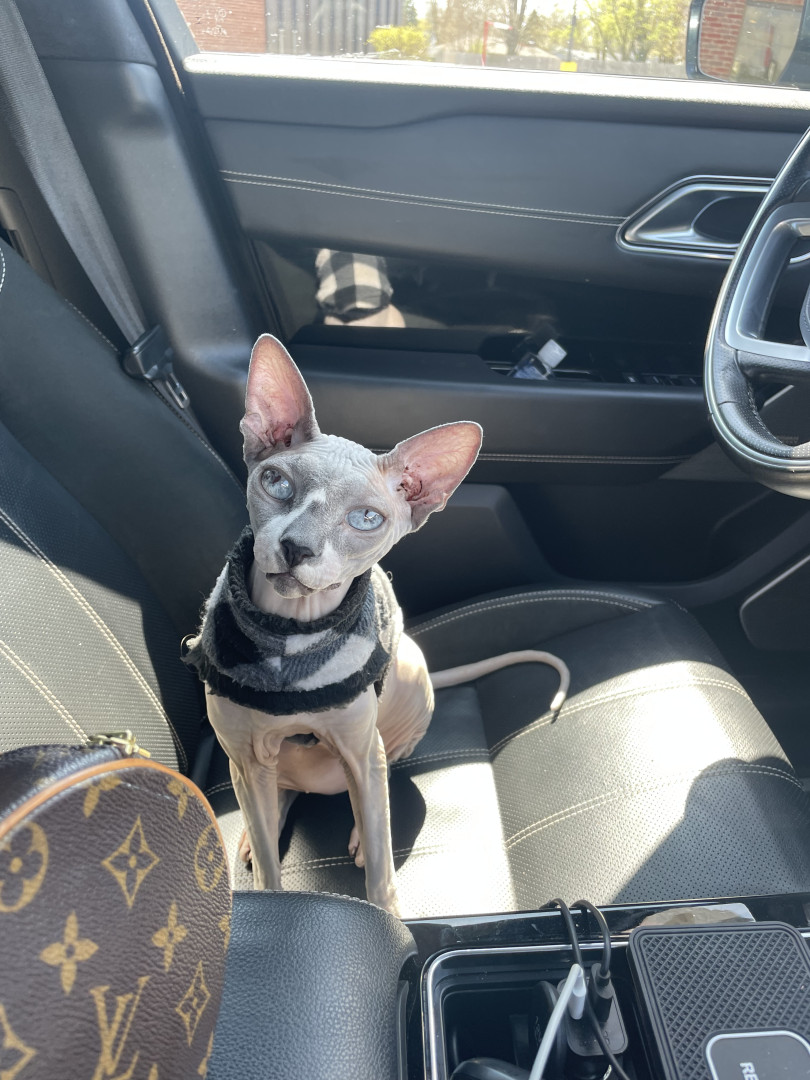 Walter is a very snuggly little guy! He loves his sweaters because he is a naked kitty! He loves traveling, “pup cups” and sunbathing.