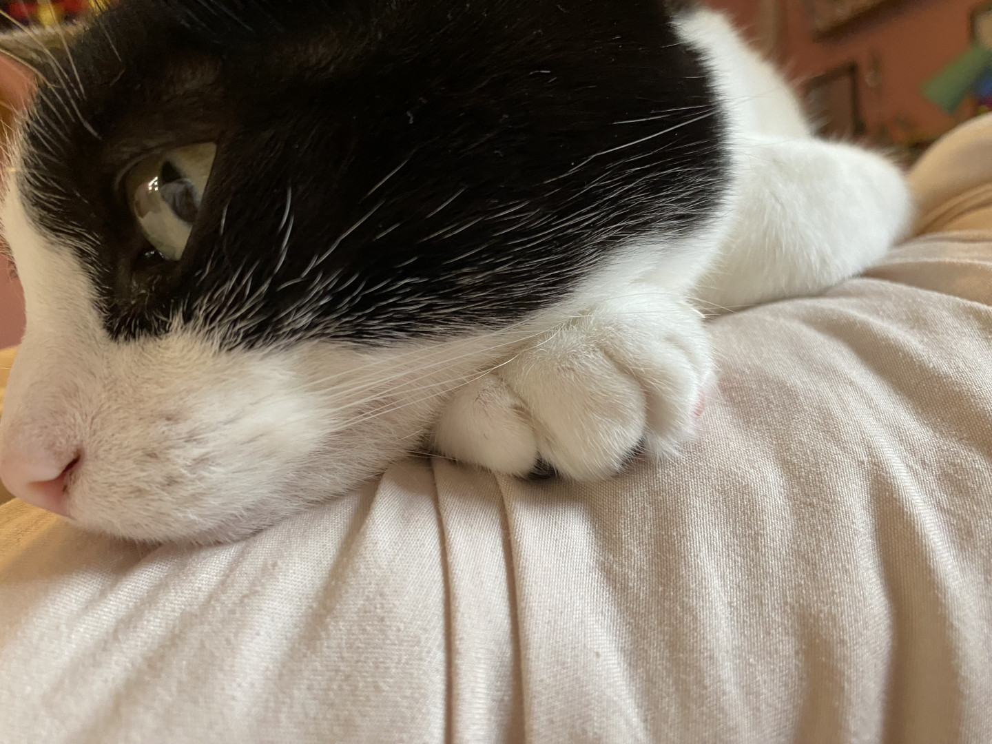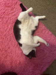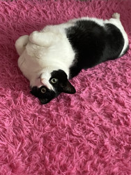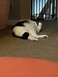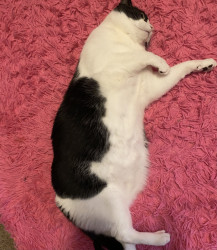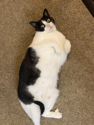 He is very chunky and playful and does not run and hide like most other cats. He stays out, loves to be pet and snuggled and is always just chilling with everyone.