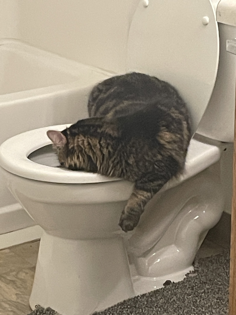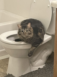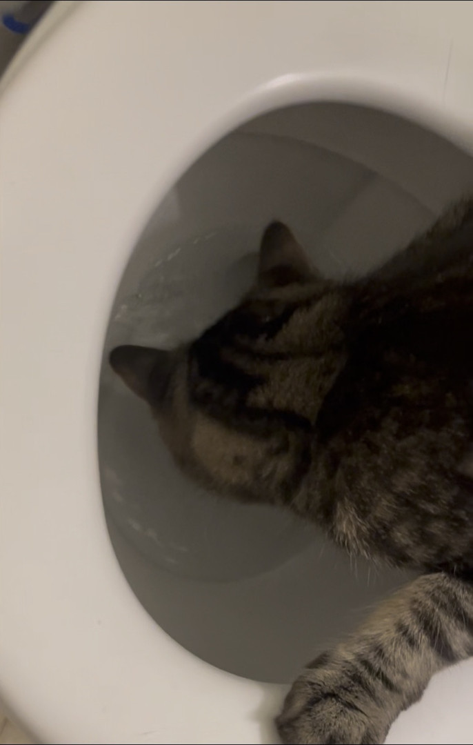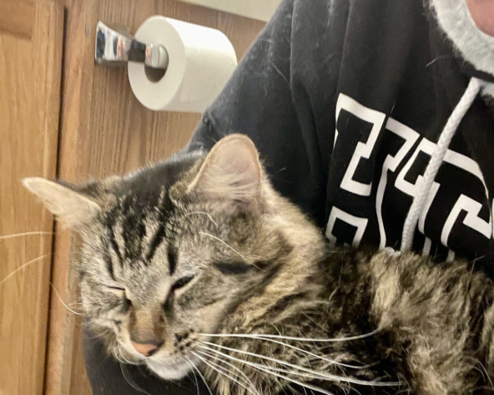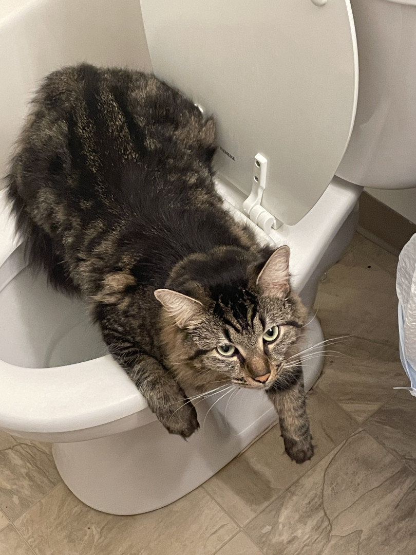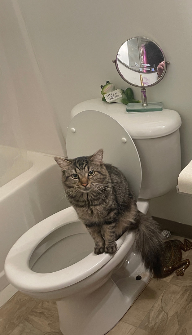 He ONLY wants to be on your lap when you’re sitting in the bathroom. But he also keeps the seat warm when nobody else is sitting there. He passionately protects his fur family from his twin Mr.Copy Cat who hangs in my hallway, sits on my dresser, and guards my medicine in the bathroom cabinet. In our little cat hierarchy he floats back n forth from Alpha to the opposite end of the line as a cat litter kicker, where he covers up their vile little piles just to give me a great big smile.😊