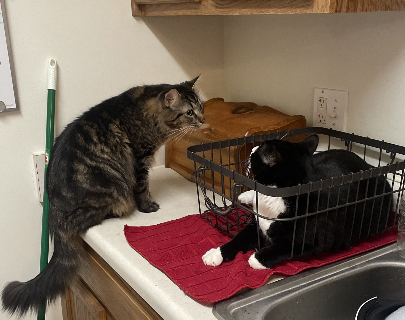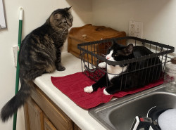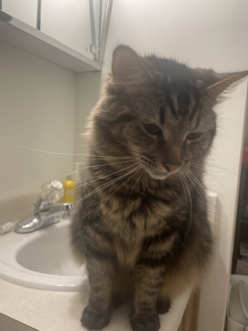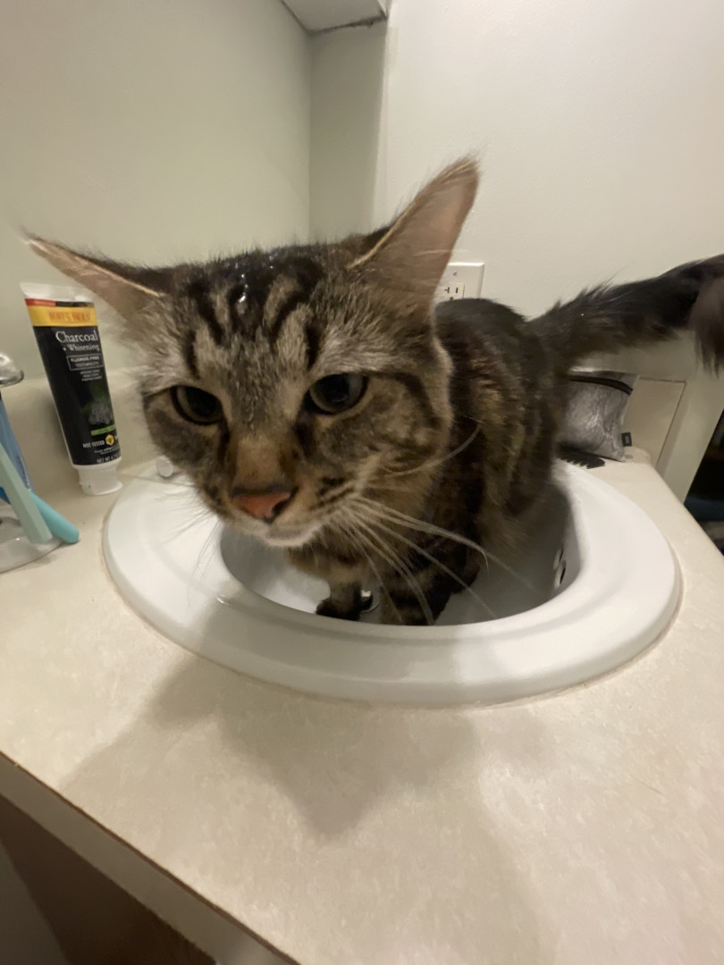 He ONLY wants to be on your lap when you’re sitting in the bathroom. But he also keeps the seat warm when nobody else is sitting there. He passionately protects his fur family from his twin Mr.Copy Cat who hangs in my hallway, sits on my dresser, and guards my medicine in the bathroom cabinet. In our little cat hierarchy he floats back n forth from Alpha to the opposite end of the line as a cat litter kicker, where he covers up their vile little piles just to give me a great big smile.😊