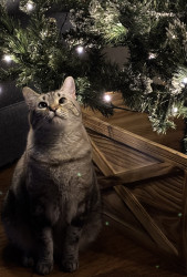Velcro kitty. Loves to lay on phones and low male voices. Has kitten like chirpy meows.
