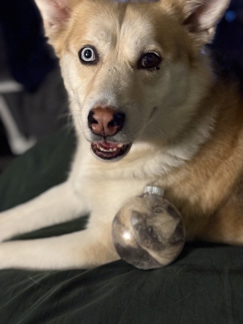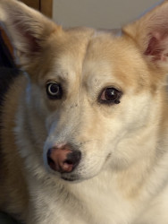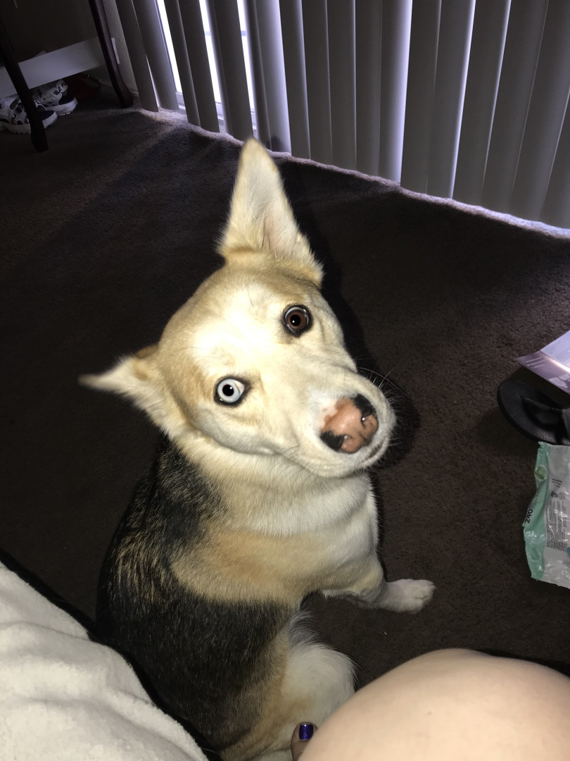 He has one blue eye and one brown eye. He is also a saddleback and an agouti. Which is quite rare to be both. His color pattern also has banded strips of browns, whites, and blacks. He is also one of the most friendly dogs I’ve ever met. He has a pet rat as well!