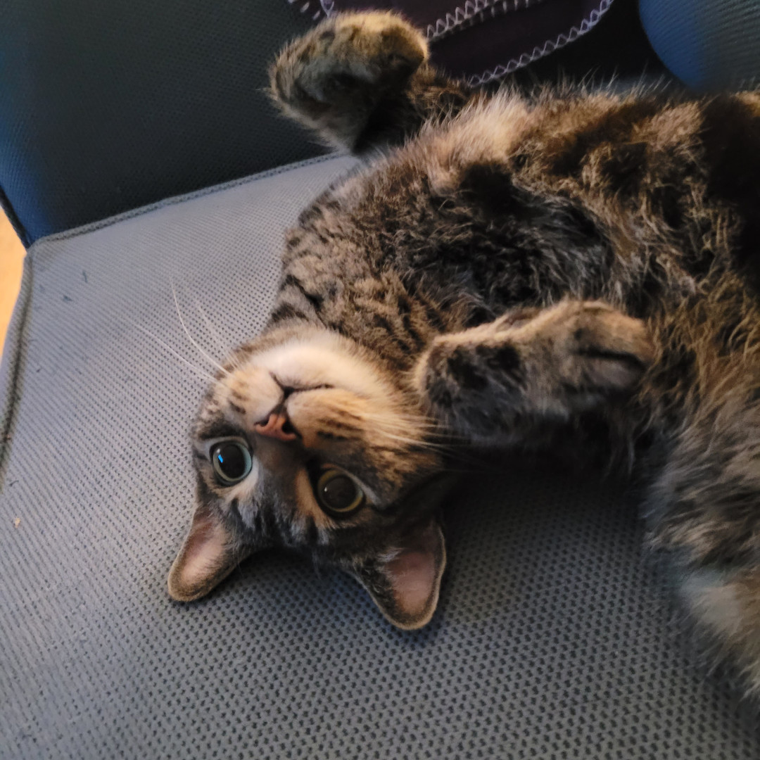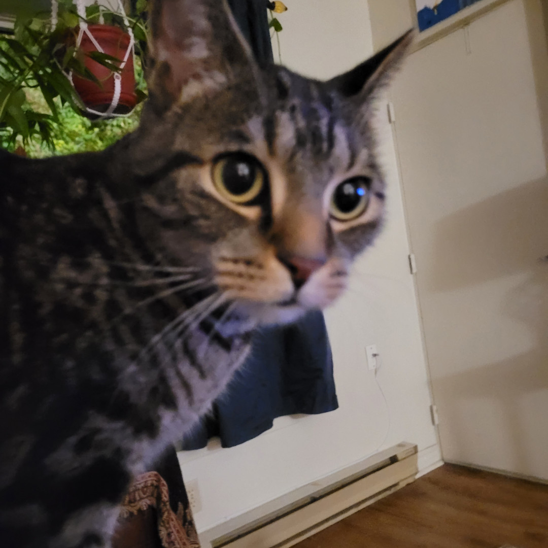 Curiosity, his nickname is curious George! Loves to cuddle right up on my neck & hugs me with his paws 🐾. Purring & then licks my chin or nose!