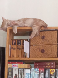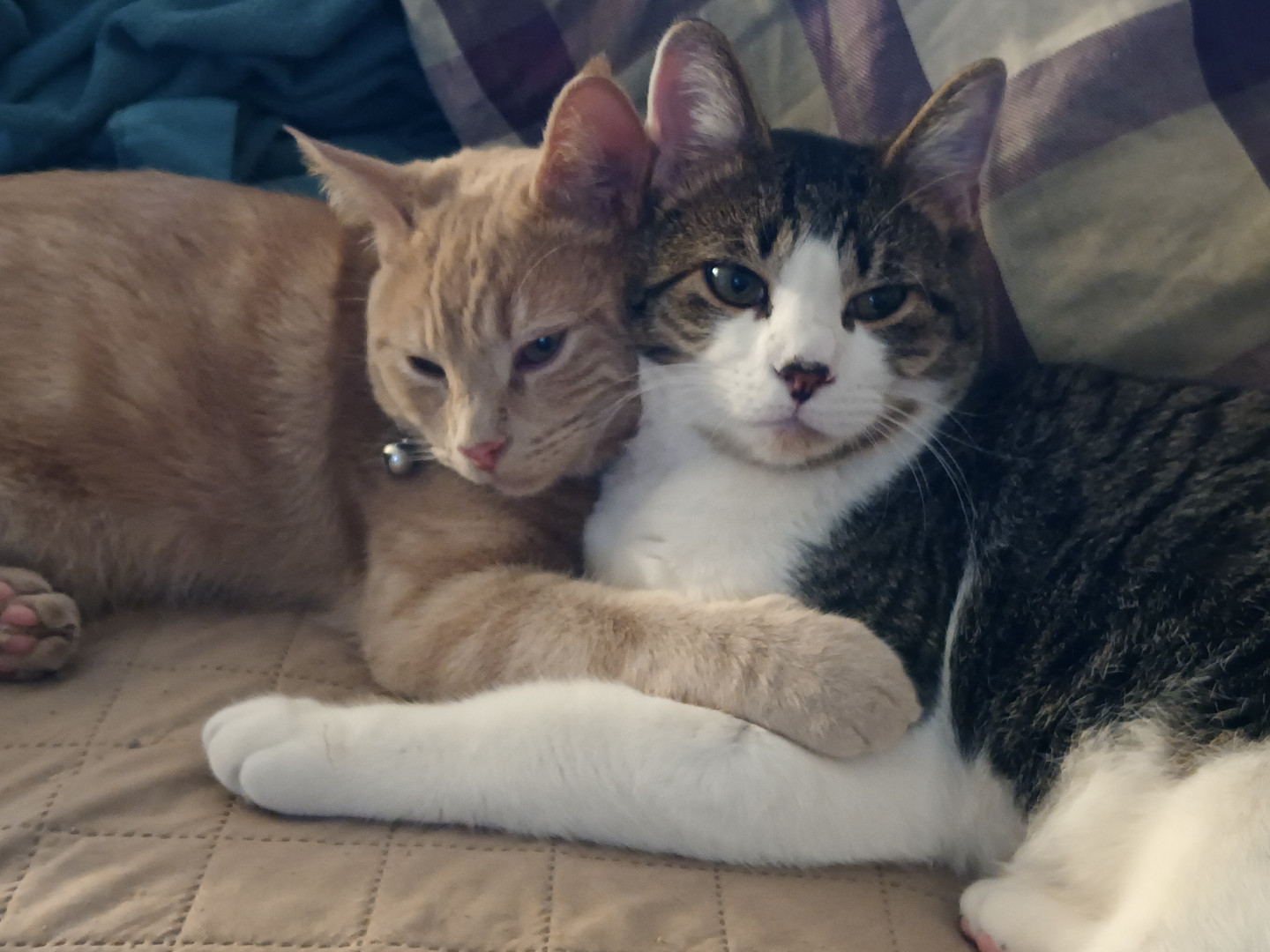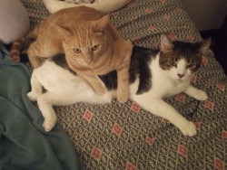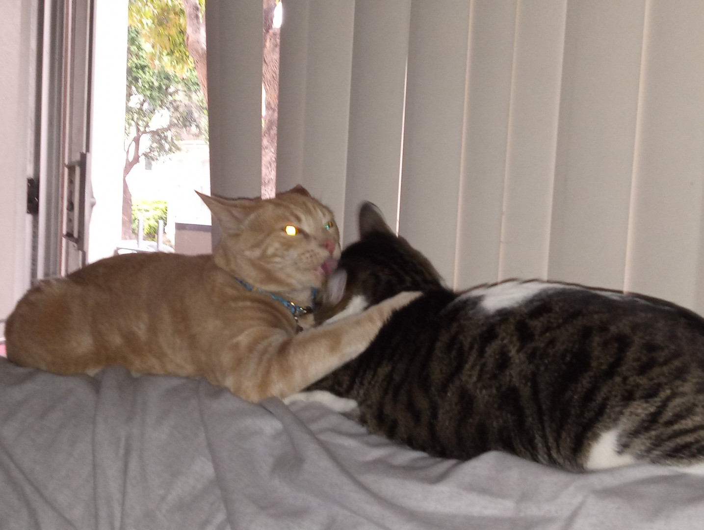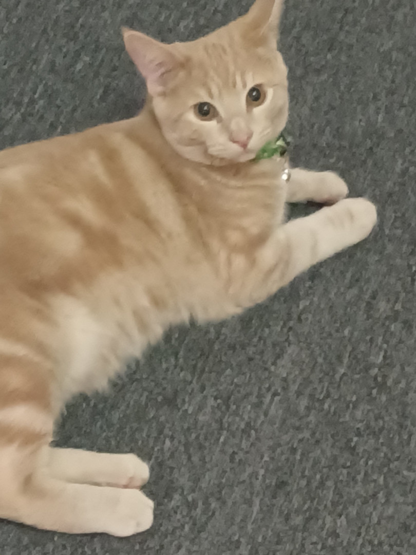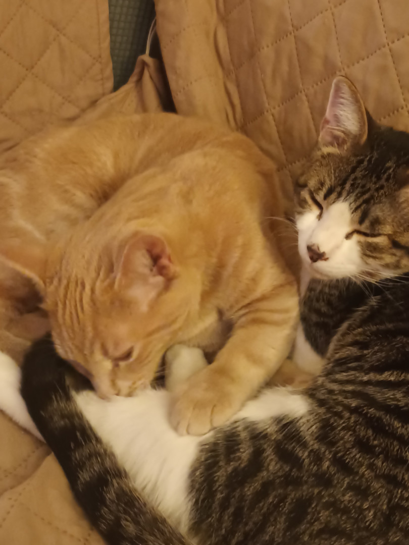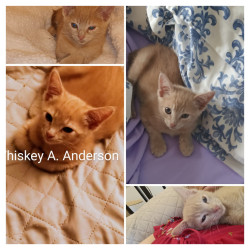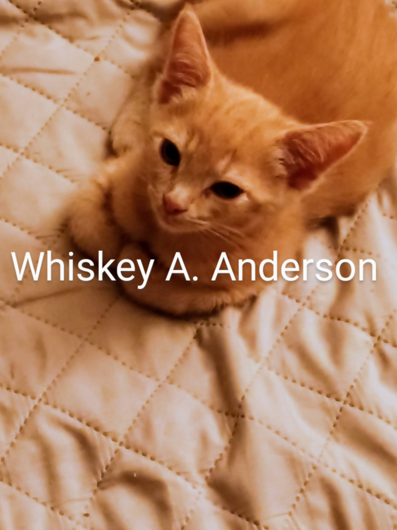 Whiskey is a cute combination of Garfield and Heathcliff the cat. He loves to sleep and eat. He likes to start his day by chasing his sister Silver. At breakfast he has to taste everyone' food.'He has a, you can loo' but don't pick me up nature. He loves his brother Jersey even though he will chase him through the house and sit on his head and bite his legs and neck, but at the end of day he will curl up with him with his paws around his neck as if to say I love you bro.