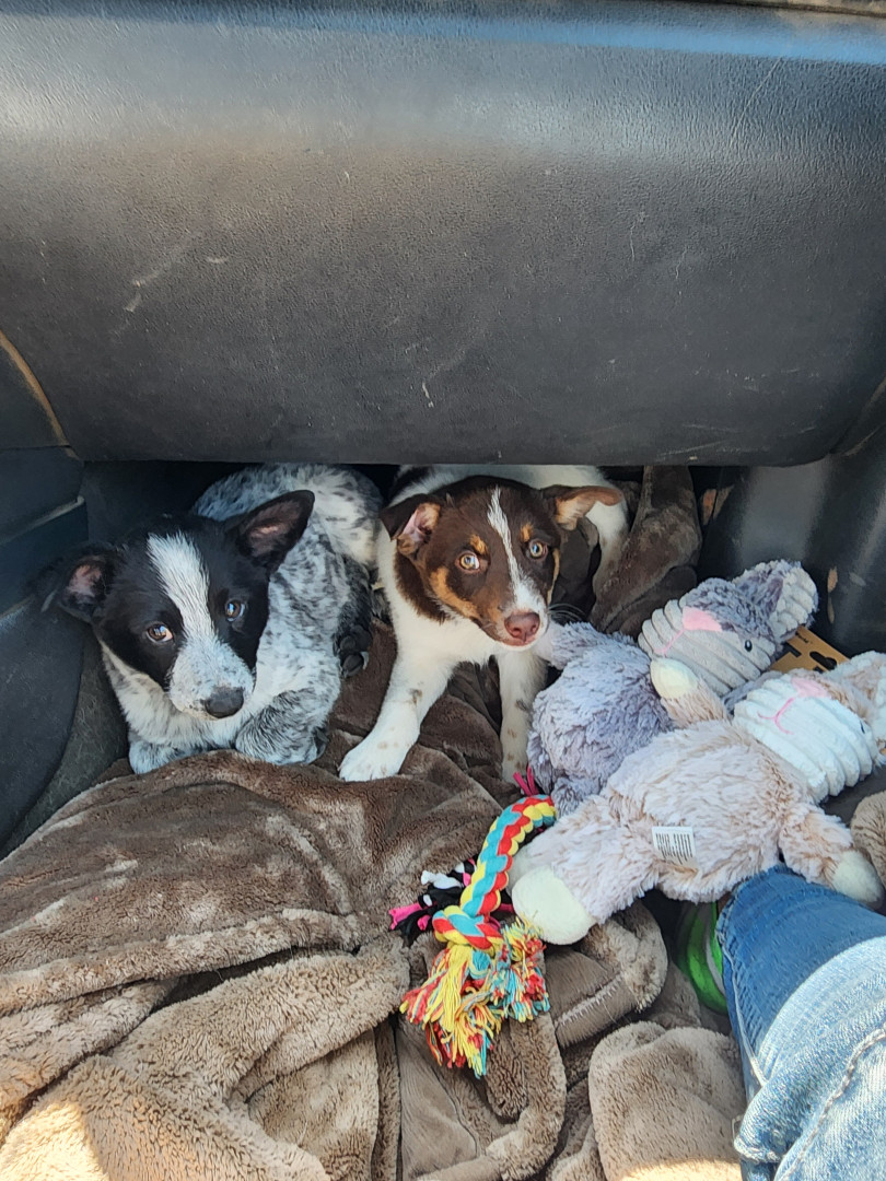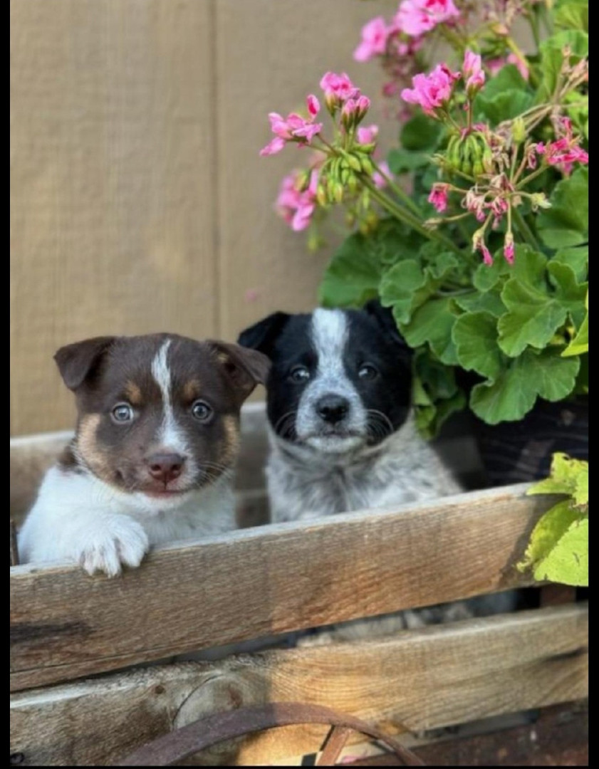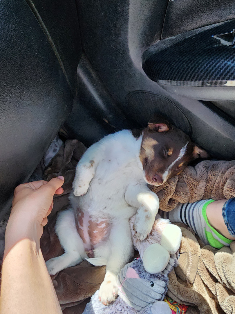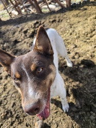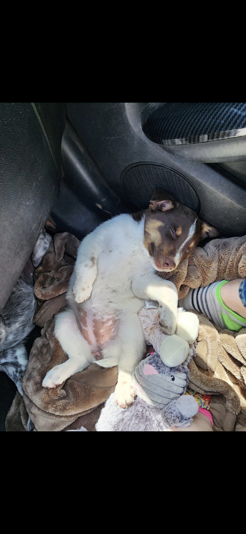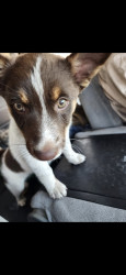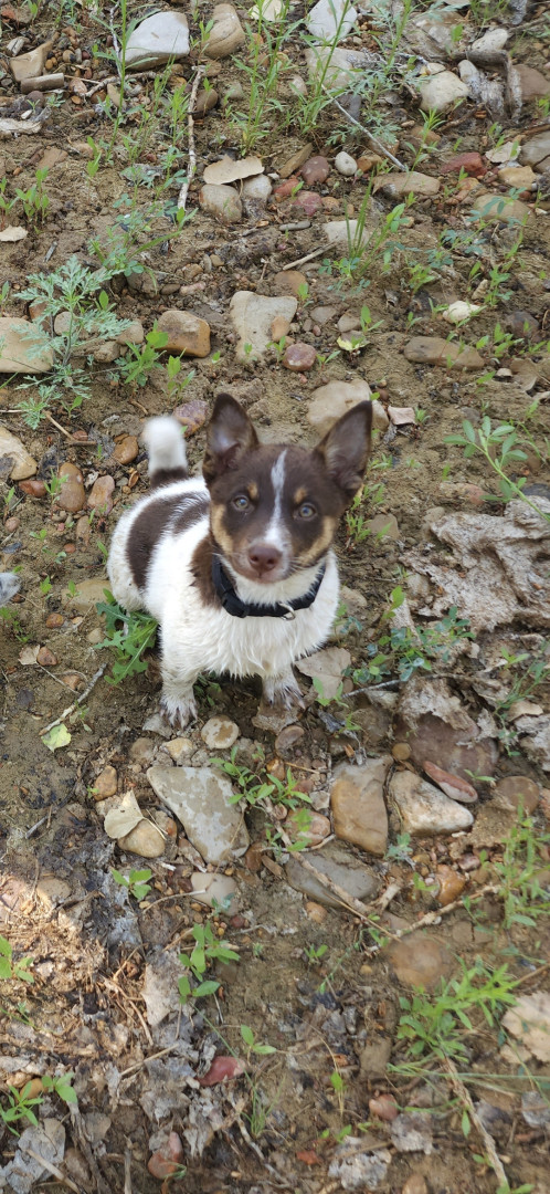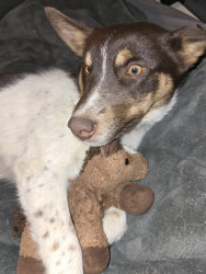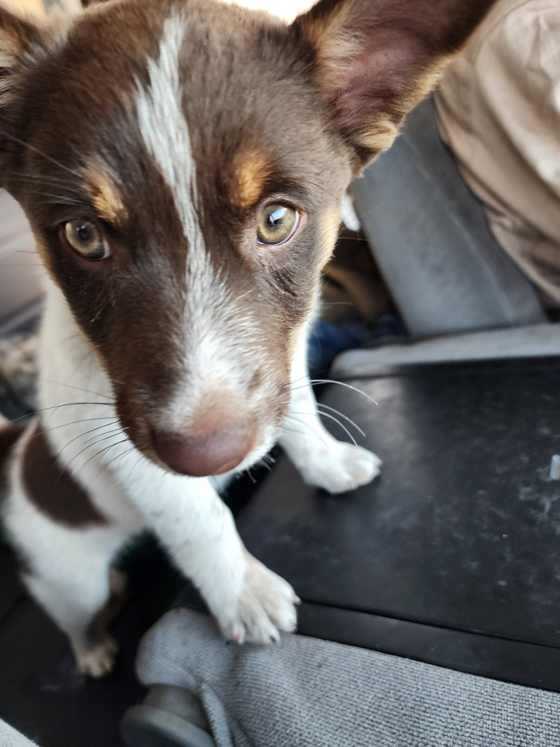 She is a mini chocolate heeler. Shes very energetic and funny. Shes got a big personality and she loves everyone.