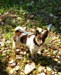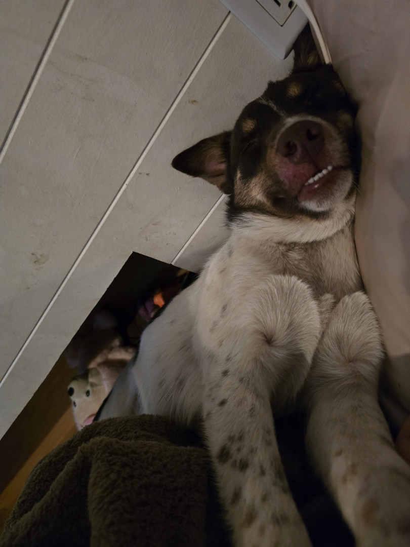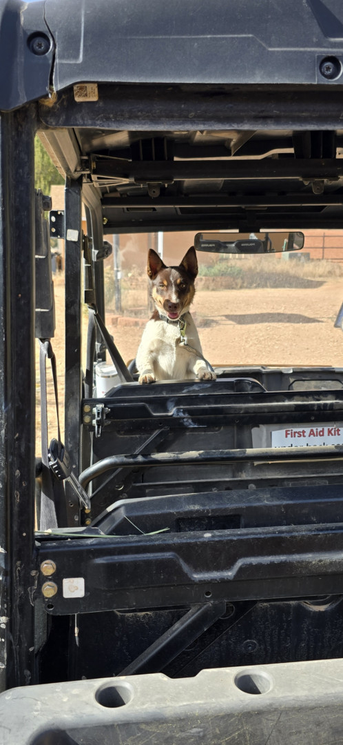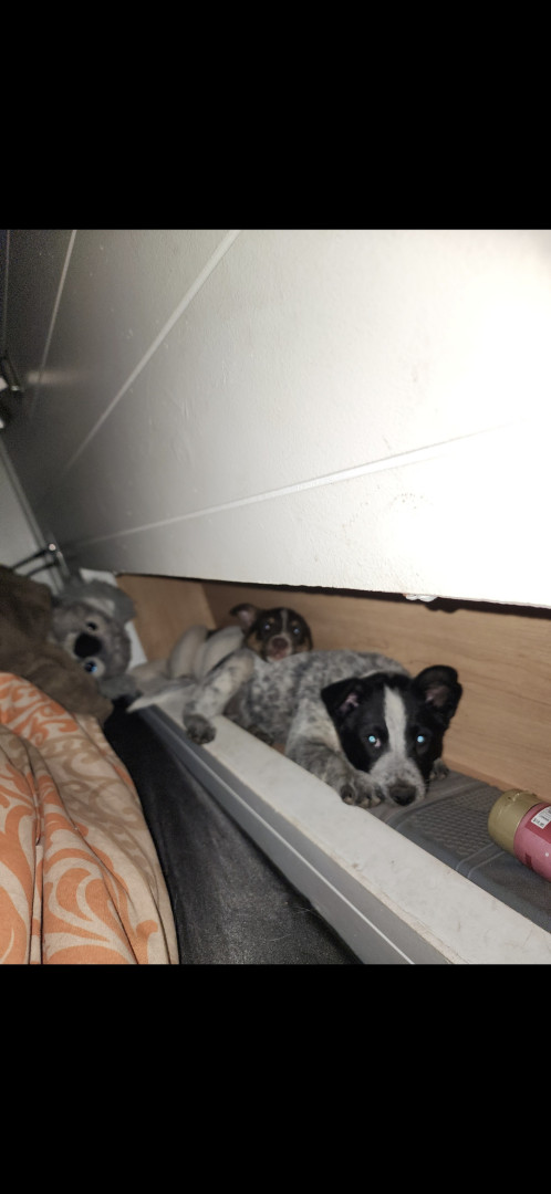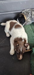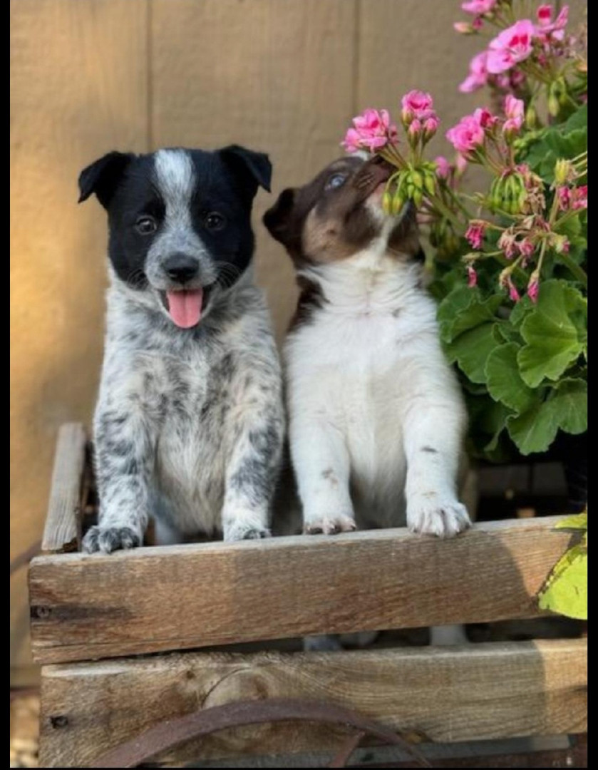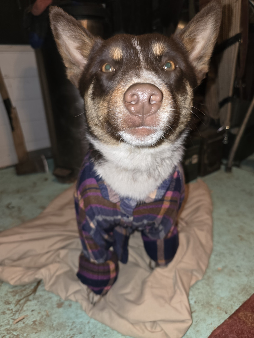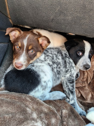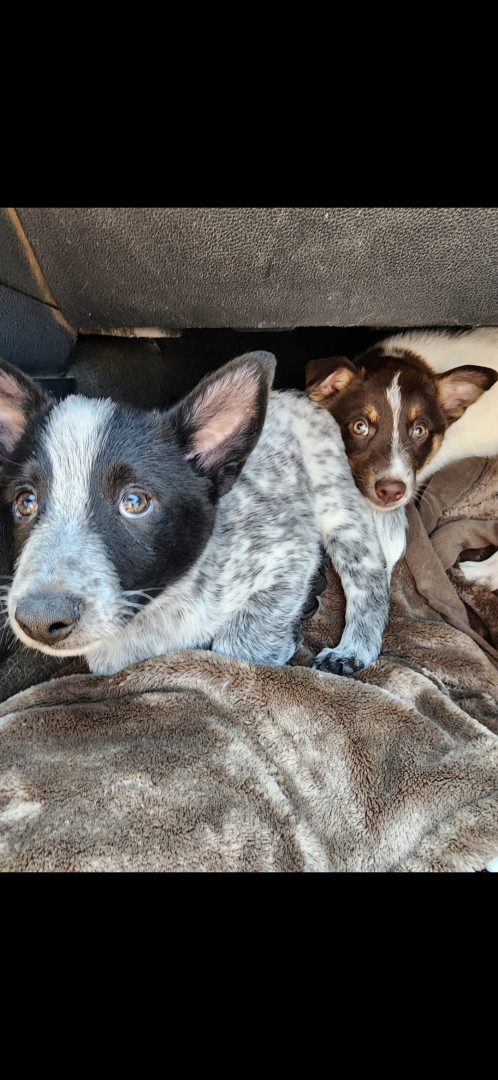She is a mini chocolate heeler. Shes very energetic and funny. Shes got a big personality and she loves everyone.