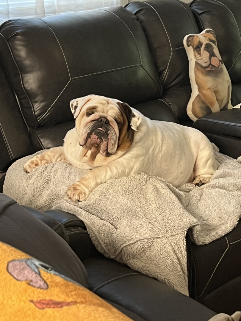 Willow is a chunky little couch queen with the squishiest face and the sleepiest smile. Wrinkles, snores, and pure bulldog perfection 💕