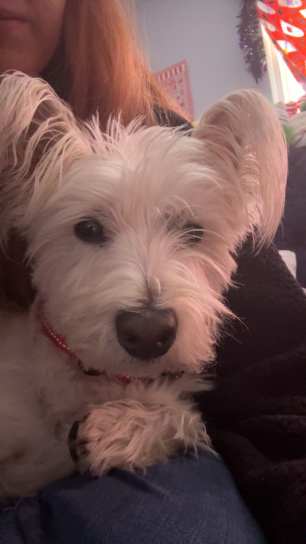 a westie, she loves cuddles, she’s very energetic, and she’s her mama’s little baby