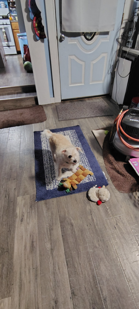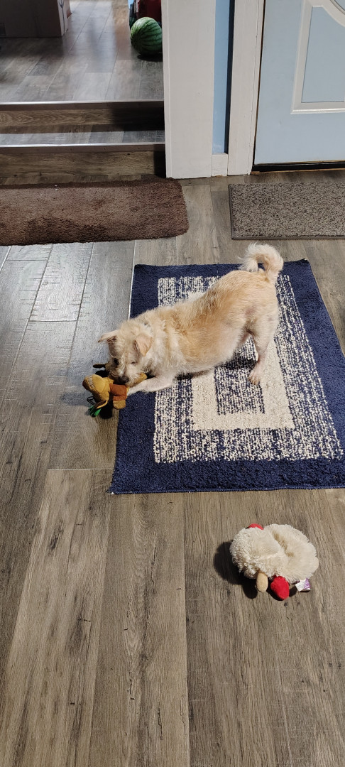 Winks favorite toy would be the first toy I gave him after he came home with me . I gave him a small stuffed lamb that squeaks ! And at first he was sick with kennel cough and recovering from his eye surgery. I had to give him antibiotics, he was a wee 7 pounds . But once he got to feeling better he started eating and playing with his new toy . His favorite treat is Milk bone dog biscuits. He especially likes the beef gravy and peanut butter kind .