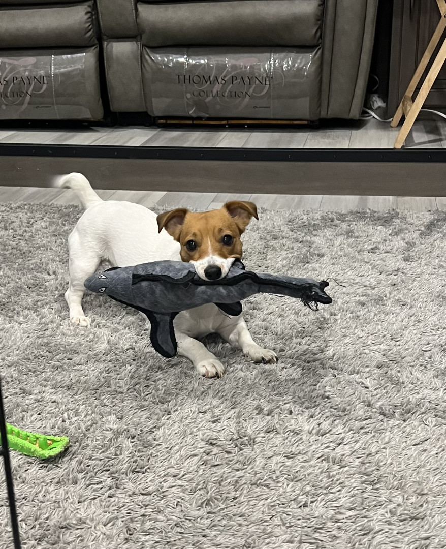 Winnie loves to have her Shark or Stingray stuffy when she sleeps or playing with her sister. Her favorite treat is any dog treat loves them all. She will got to each neighbors house in our court to get a treat. They love Winnie.