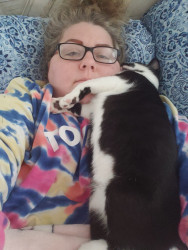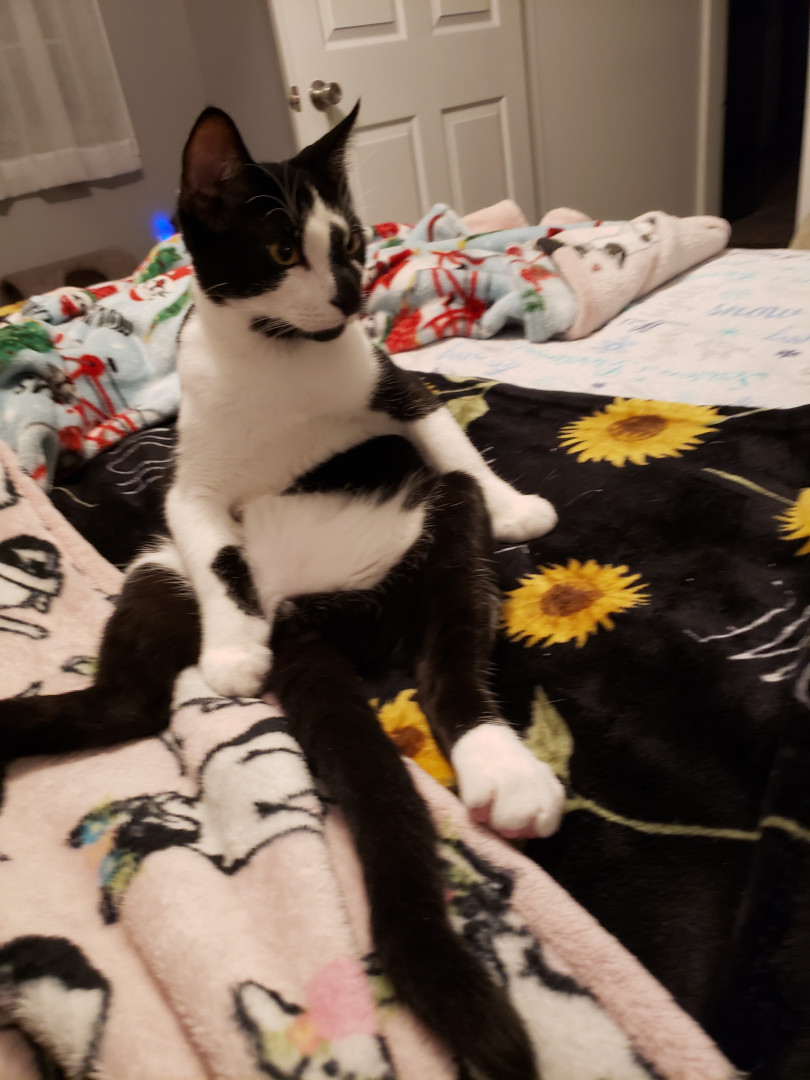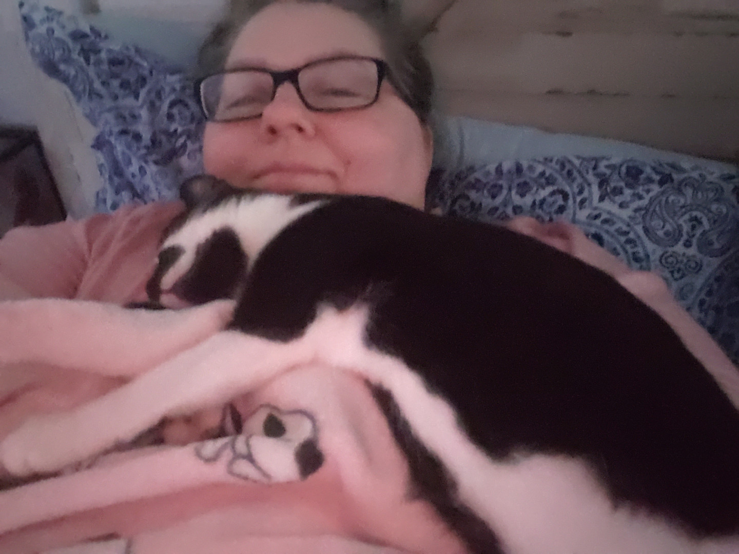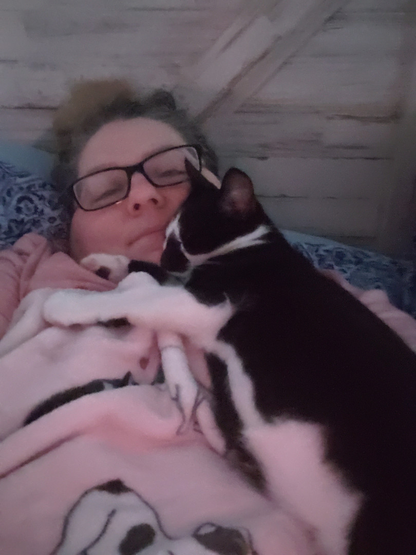 Winston is literally a mamas boy. He struggles alittle at jumping up onto high areas. Yes I've never seen a cat that can't jump that well but he does his best. So when he gets into bed with me he pulls himself up by the sheets and just comes to me in his spot and starts kneading and suckles my neck/ shoulder area right by my heart. It's just perfect and melts my heart and I know he loves me but more importantly he knows I love him. I'd be lost without him.