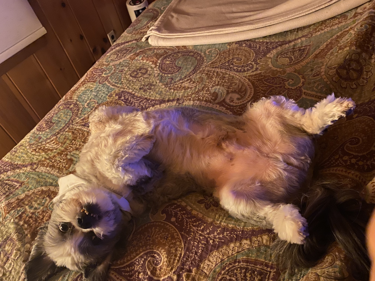 Winston is a shesjon. 1/2 bijon frise 1/2 shitzu. Soon to be 11 years old. He’s most happy right next to or on you.