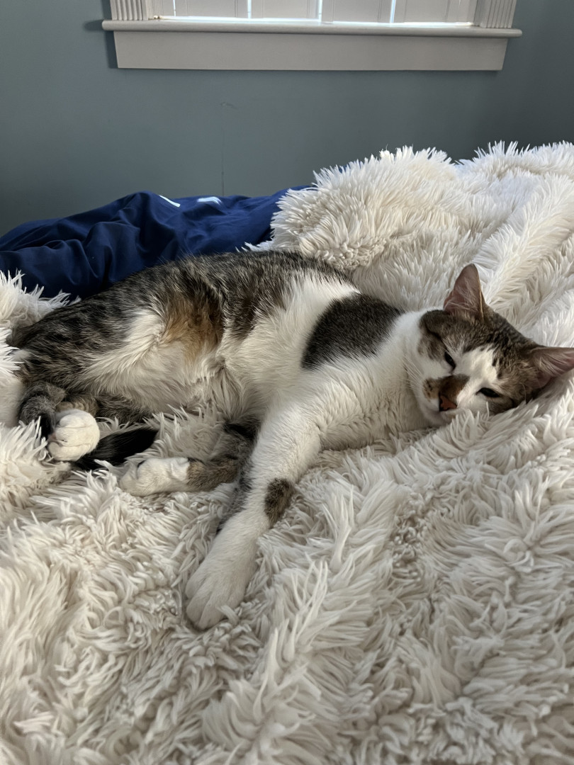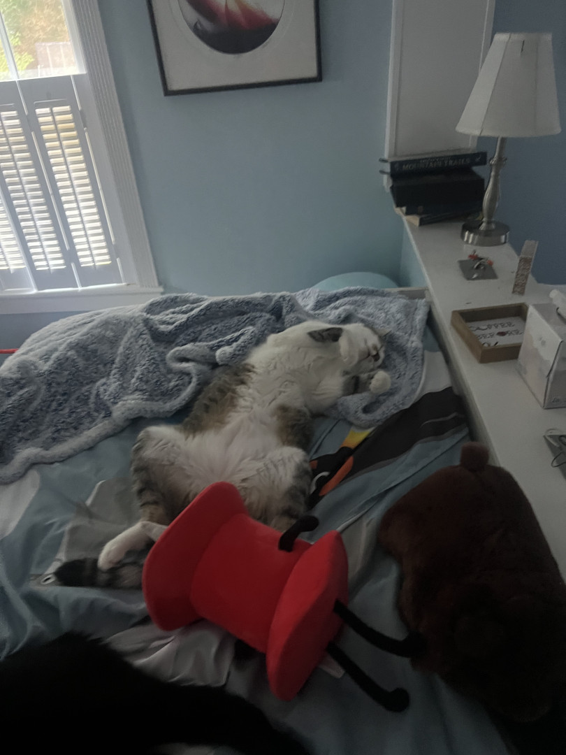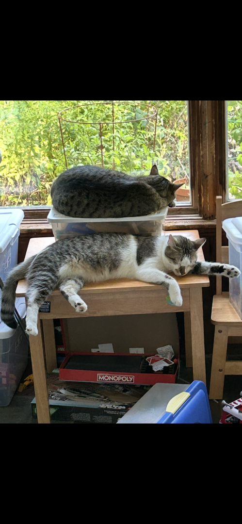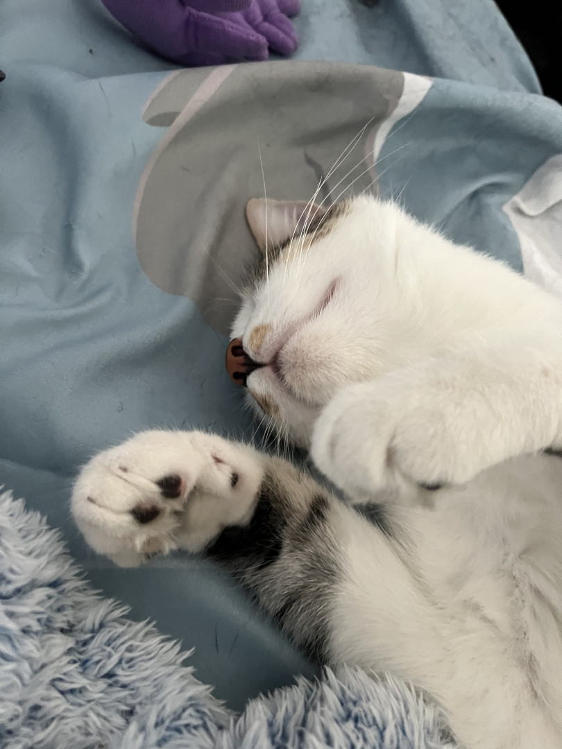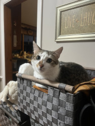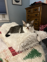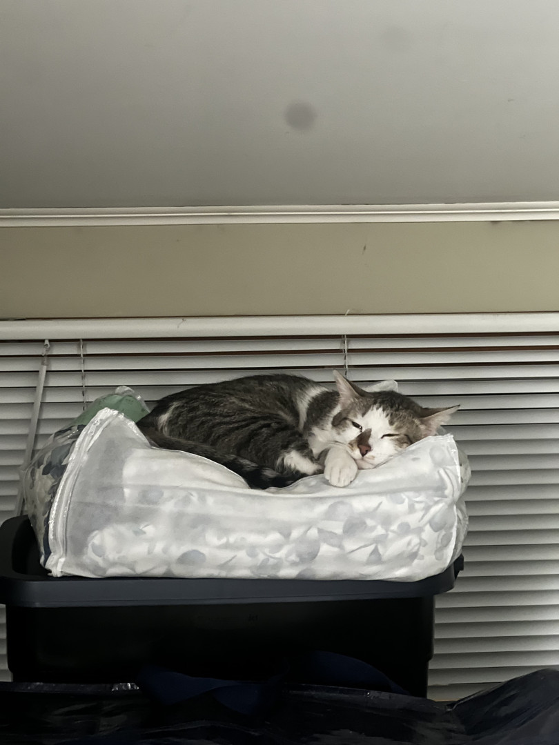 Winston is a silly boy! He loves to sleep in all kinds of spots and positions. He is a year old born on April Fools, and super adventurous!
