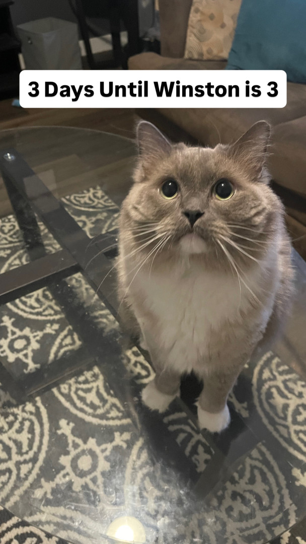 Winston is 3-years old. He is so sassy, not super cuddly but follows me everywhere I go. He loves treats, he’s very nosy and my best friend.