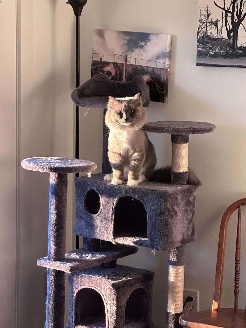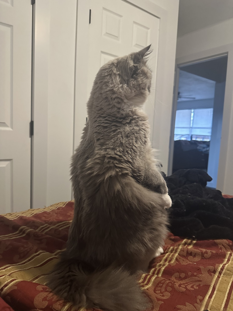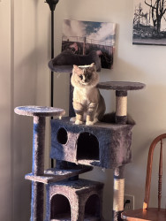 He handsome with a side of sass and side eye. He is very particular in who he likes and the way we do things everyday together. He is very independent but will lay next to me and just touch me with his paw because he does not like to cuddle. He is just such a special boy.