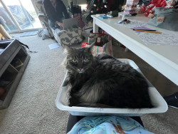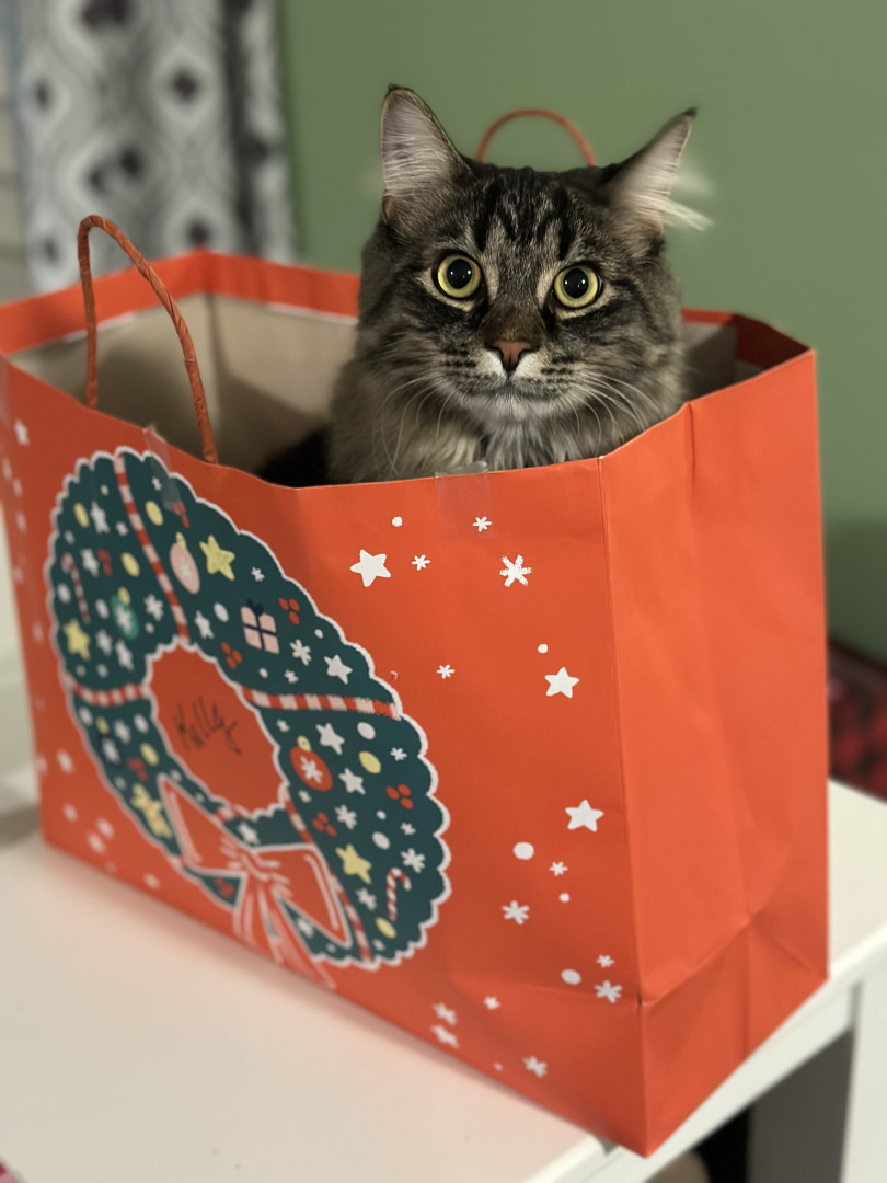 He’s a chicken loven bag cat with a tail that goes up but never goes down