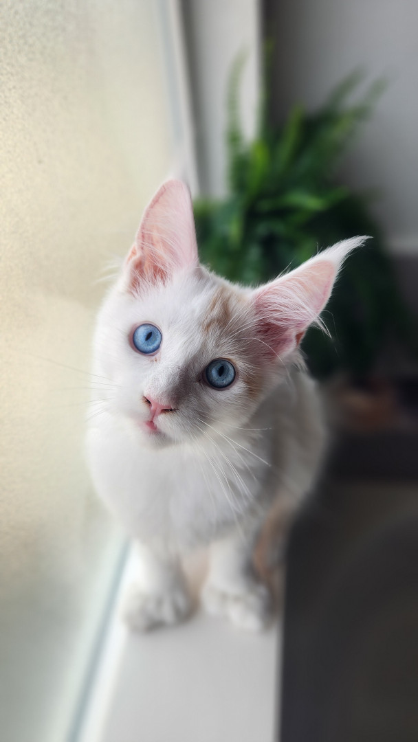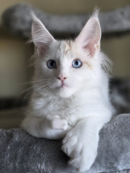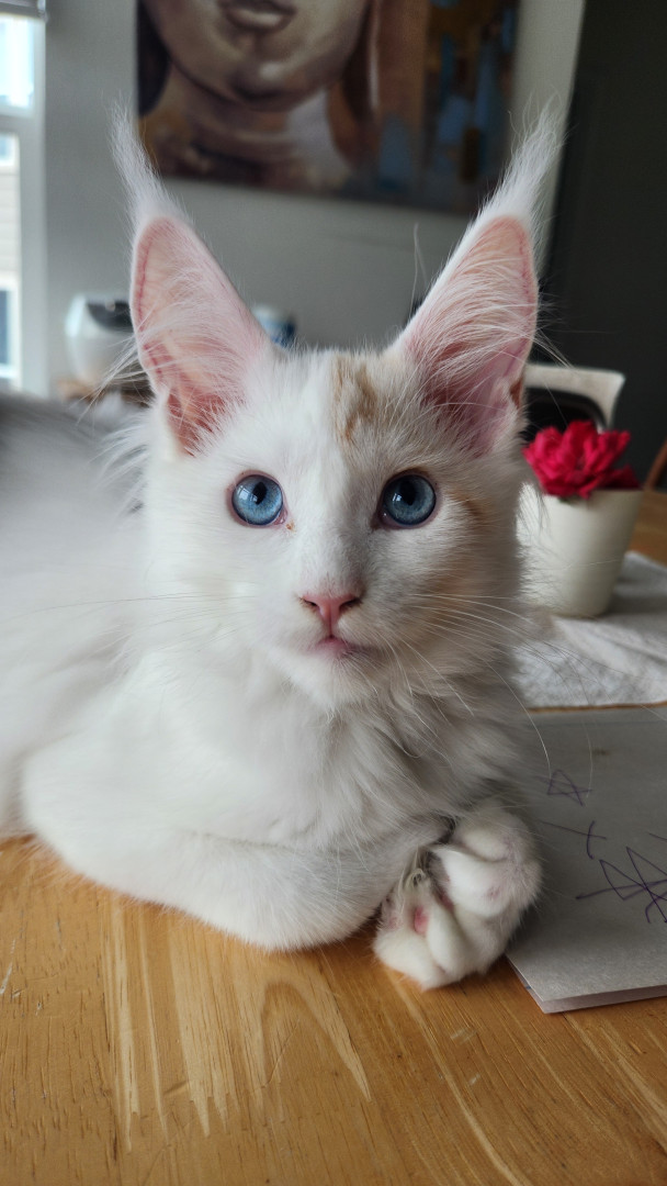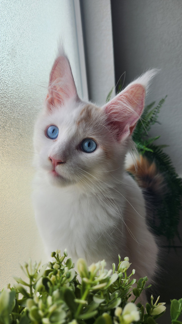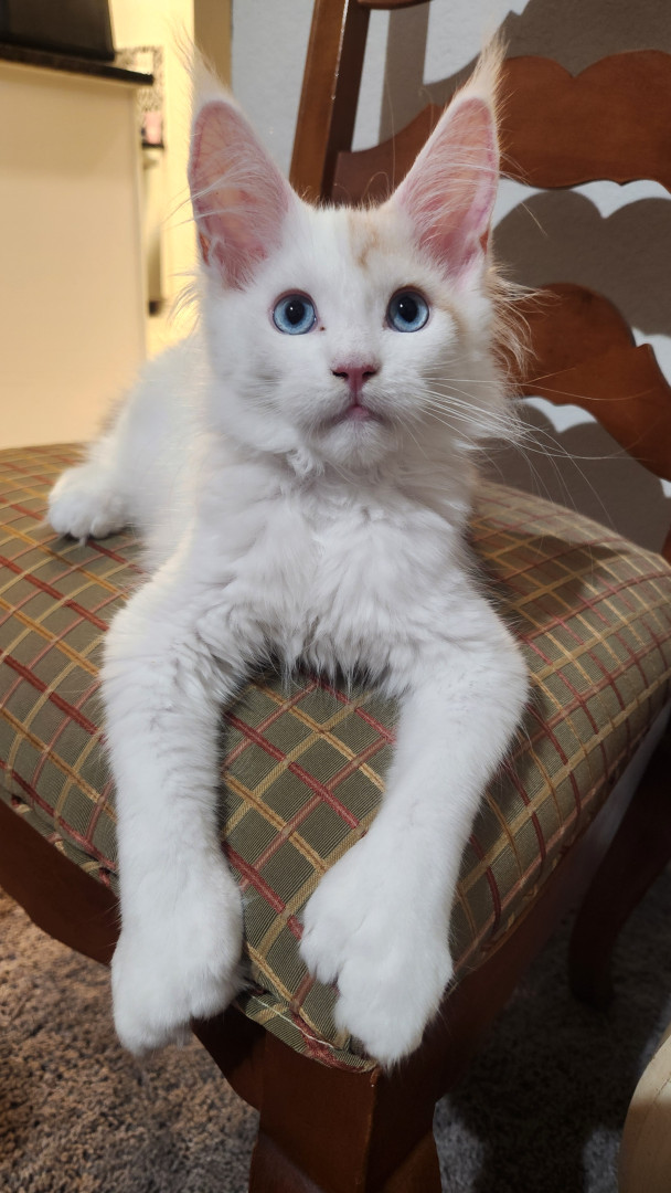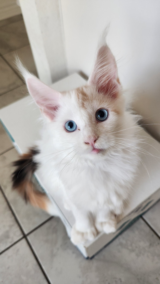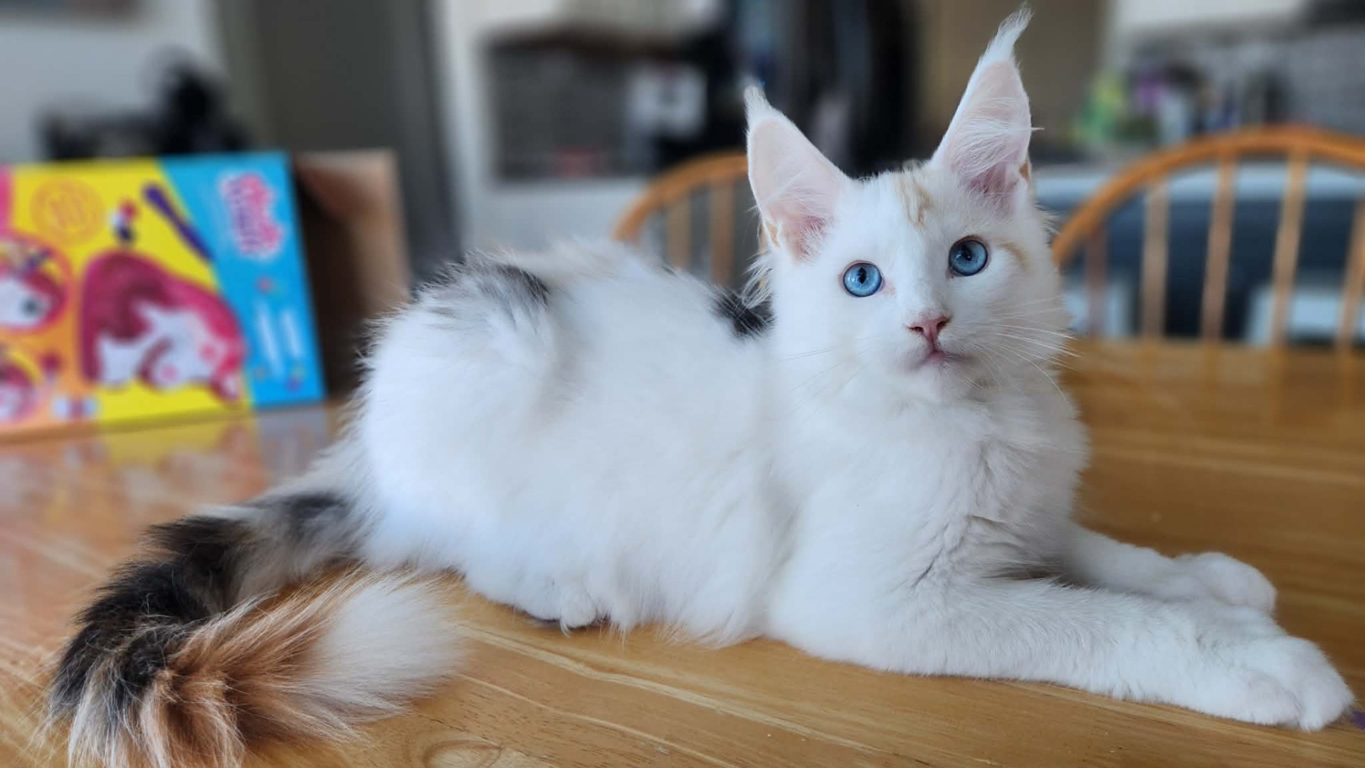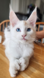 Blue-eyed calico Maine Coon with extra toes and a big personality.
