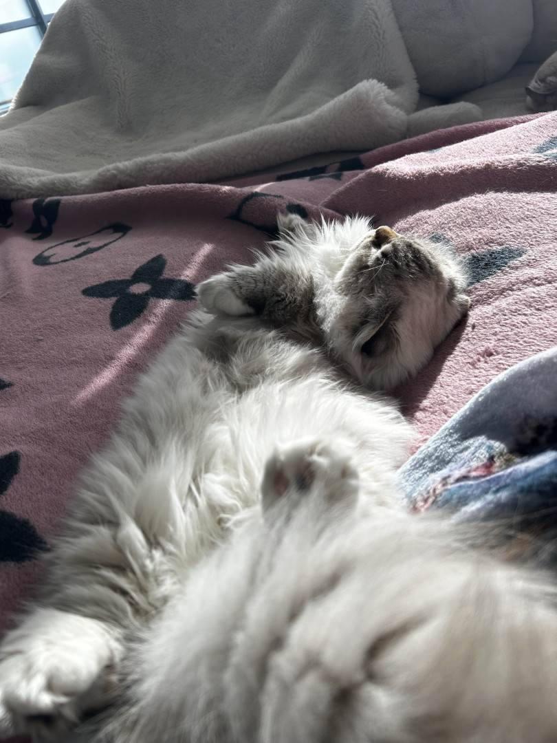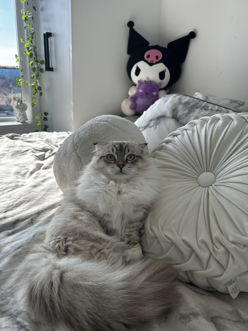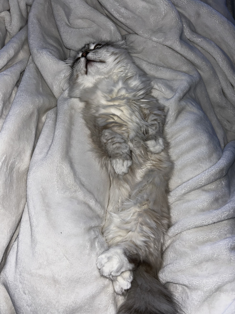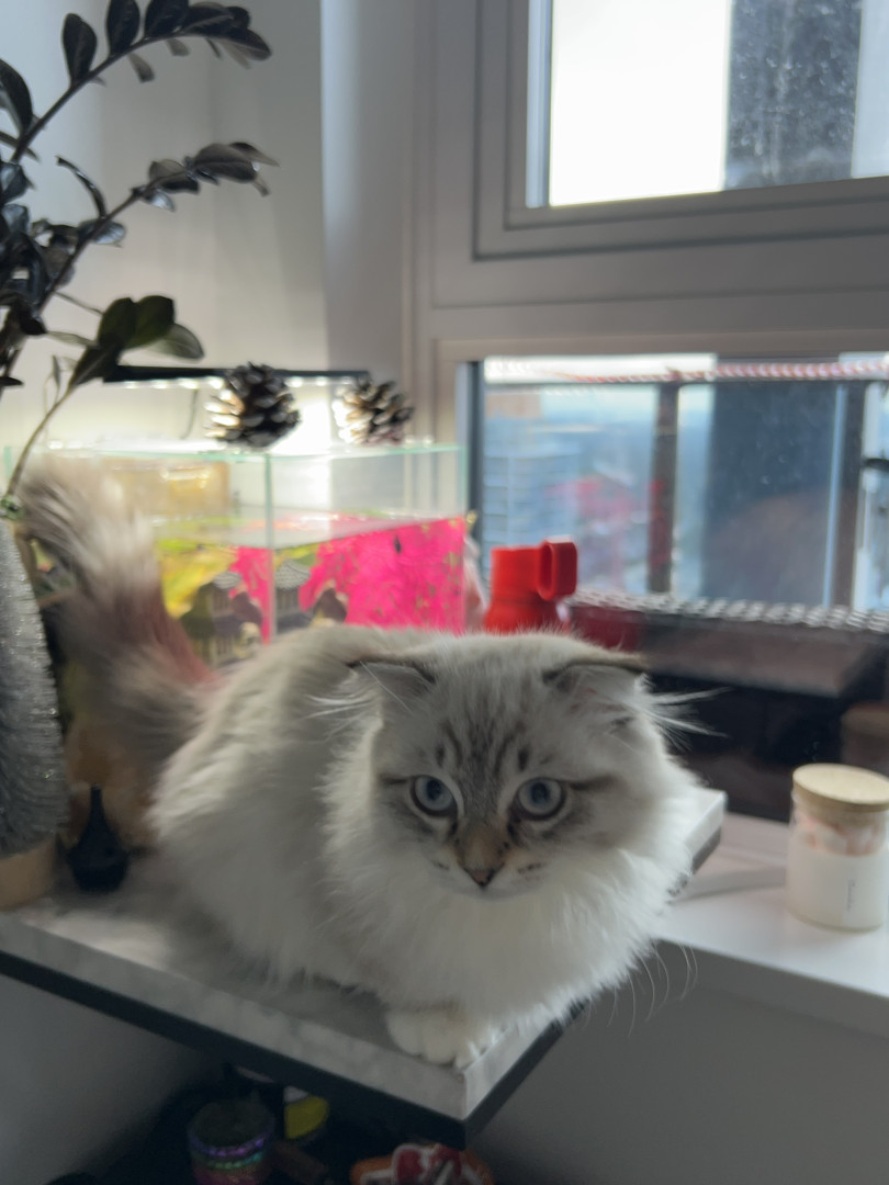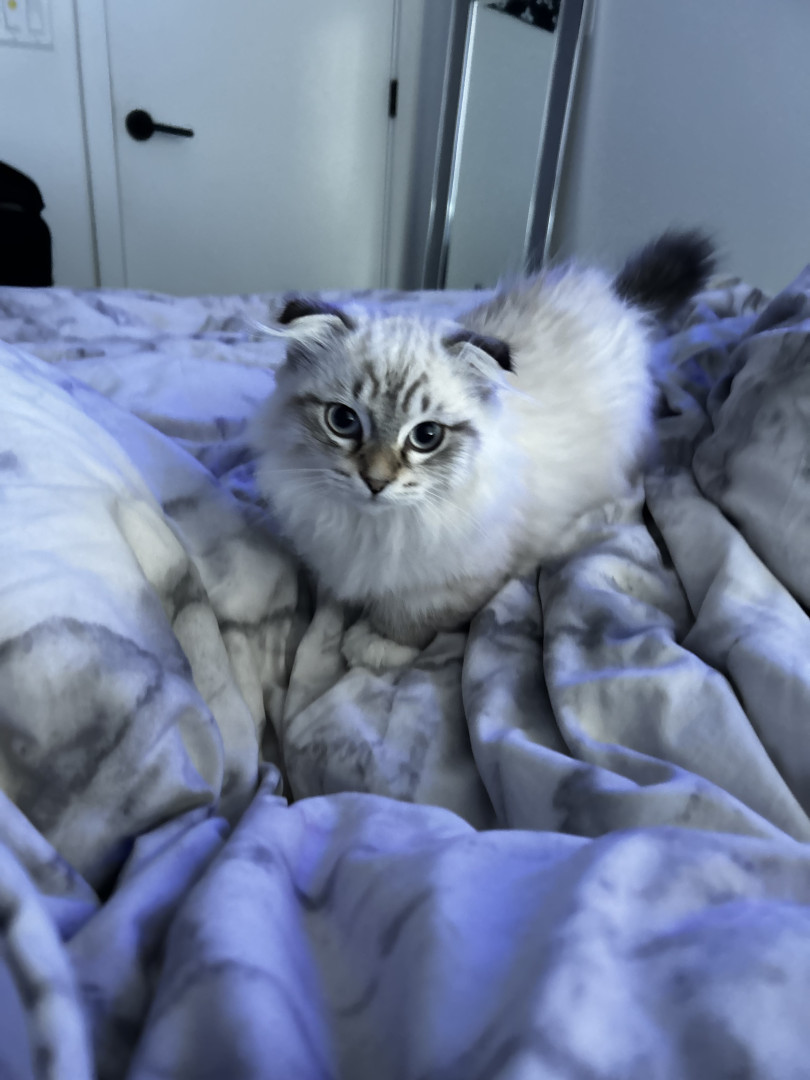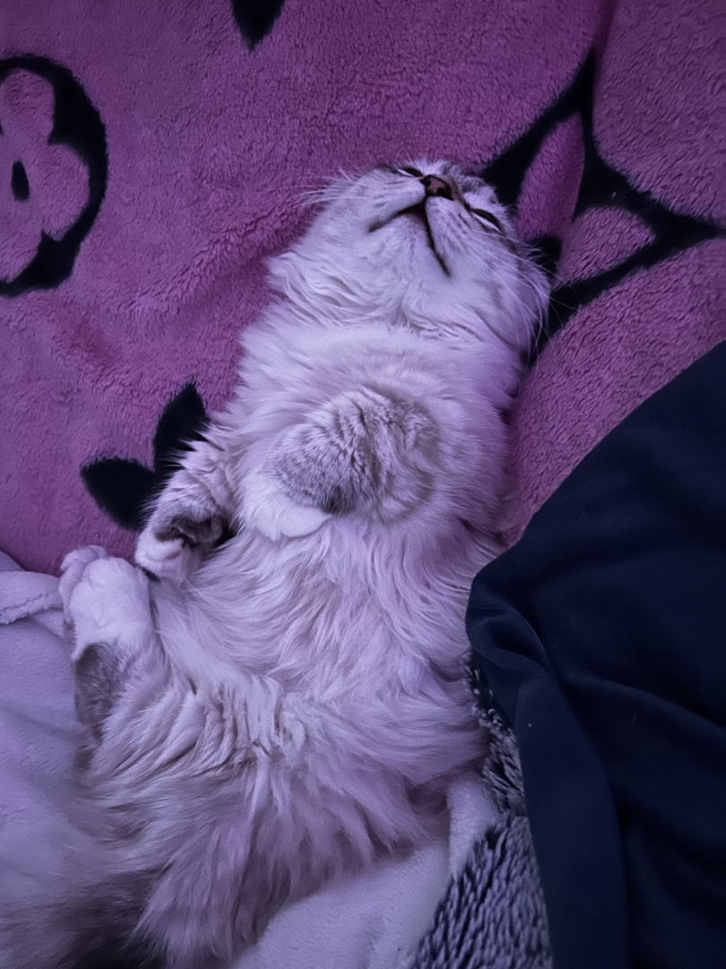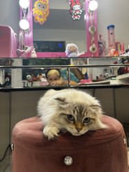 Her munchkin Scottish fold looks, but aswell as her meow.. she also loves to routinely sleep on my chest or she won’t give up meowing until so..